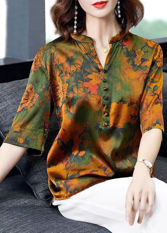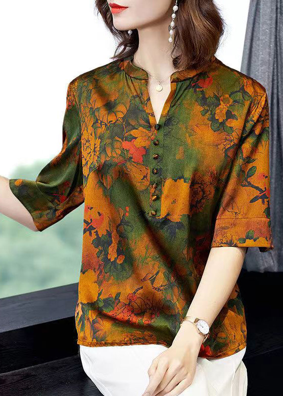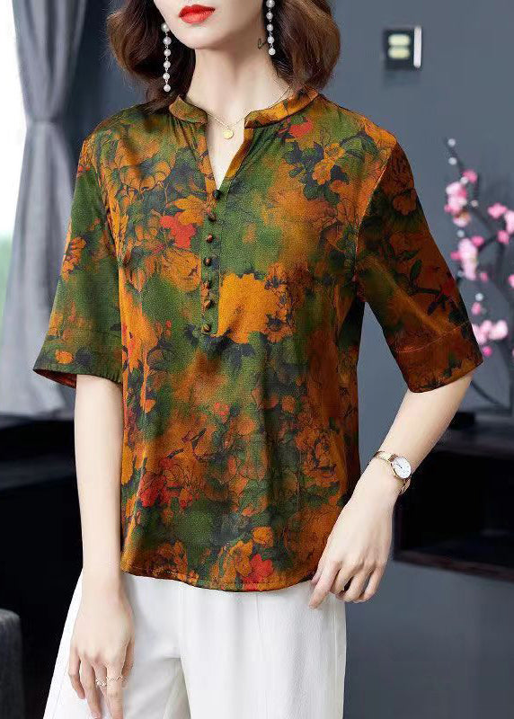 Loose Green V Neck Print Patchwork Silk Tops Summer