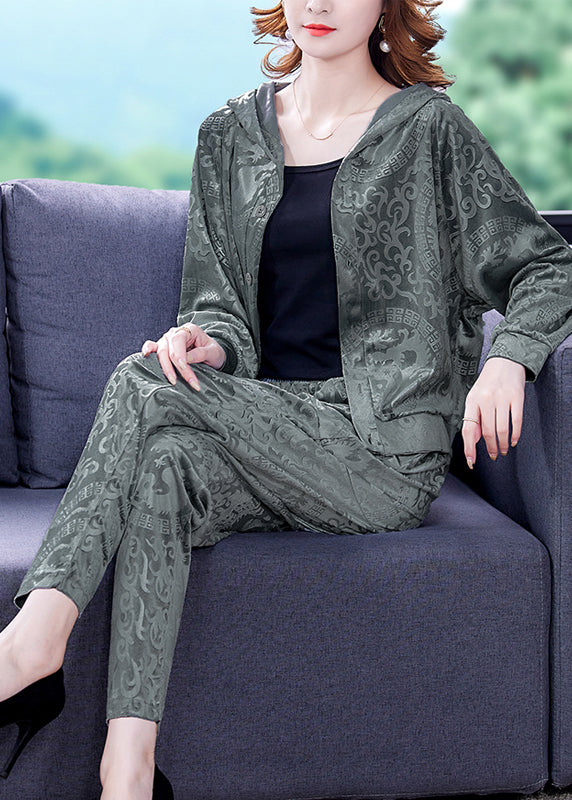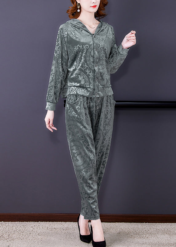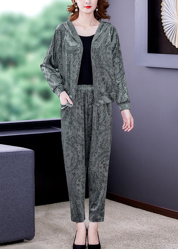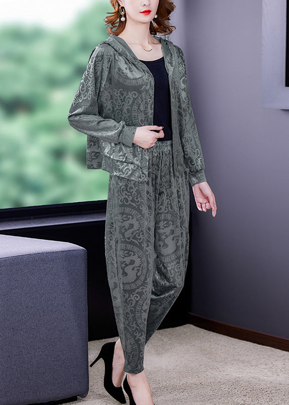 Loose Grey Print Silk Velour Coats And Harem Pants Two Pieces Set Fall