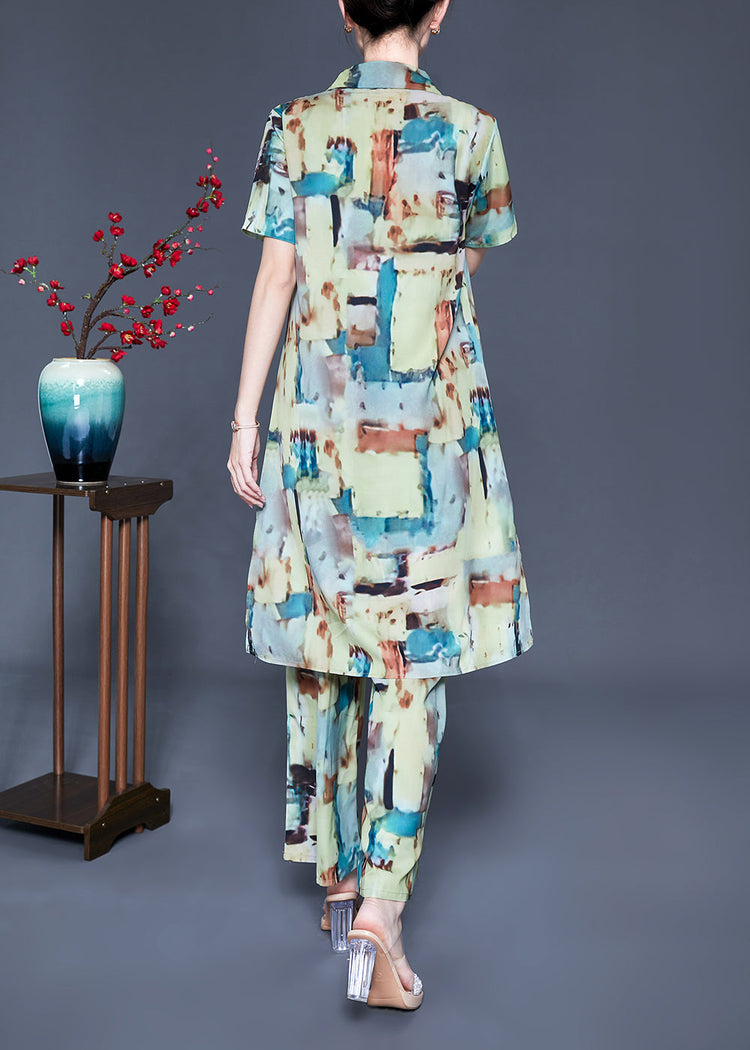 Loose Peter Pan Collar Print Silk Long Shirt And Straight Pants Two Piece Set Summer