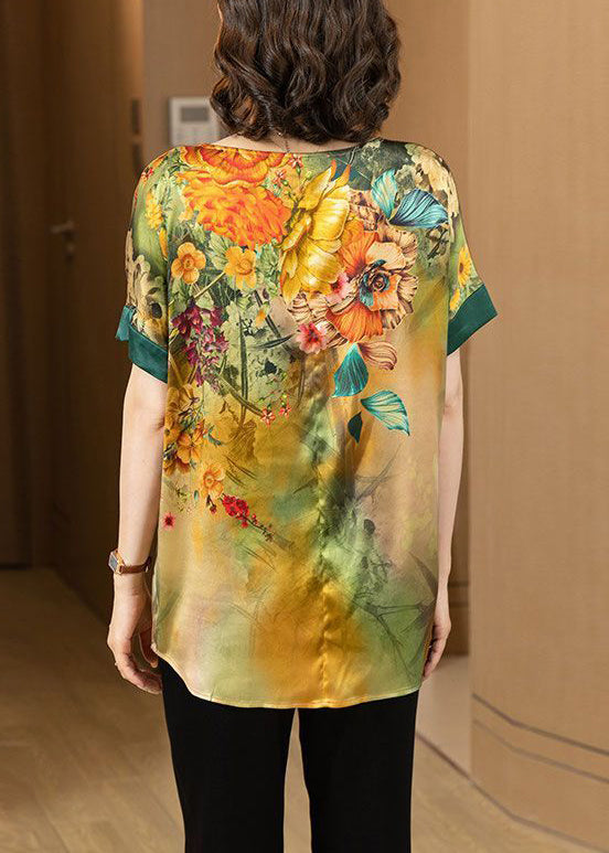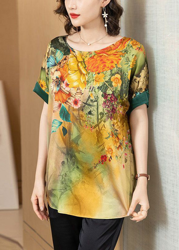 Loose Yellow O Neck Print Patchwork Silk T Shirt Summer
