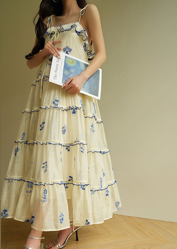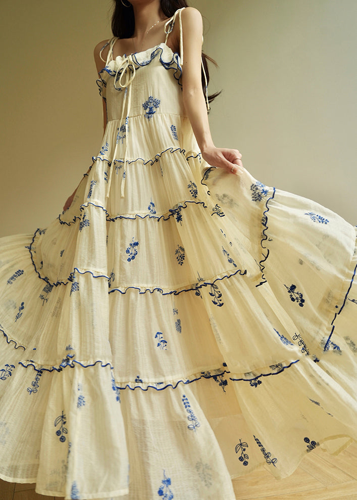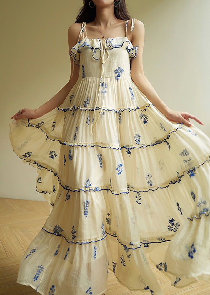 Modern Beige Ruffled Print Silk Long Dresses Sleeveless