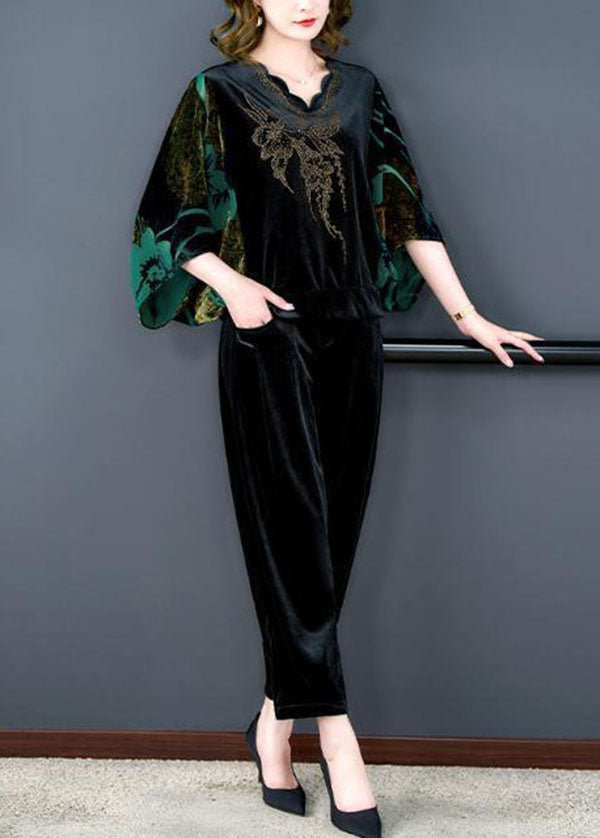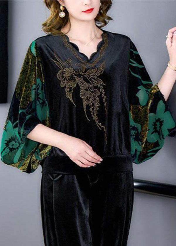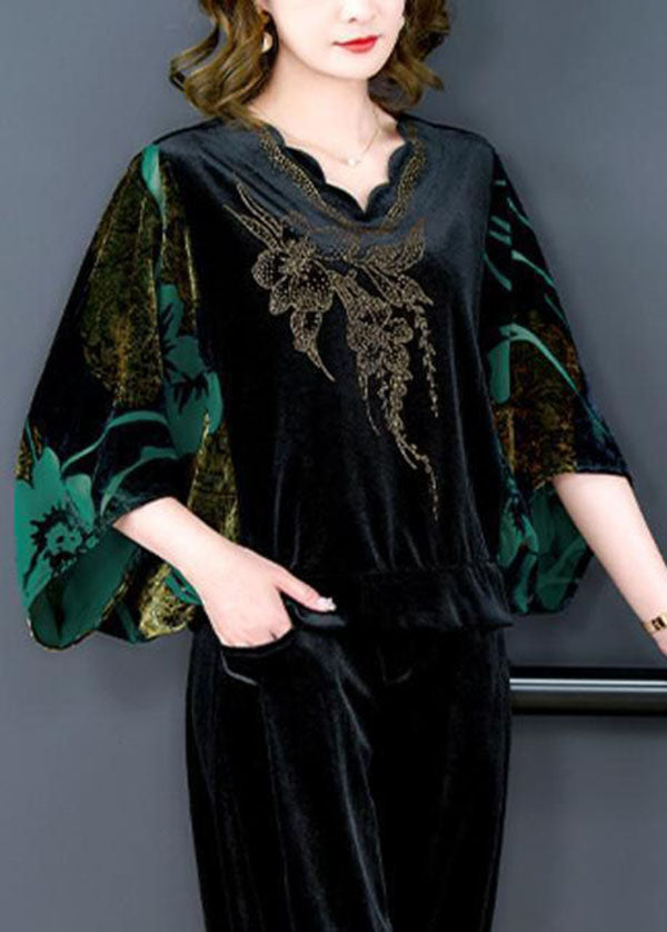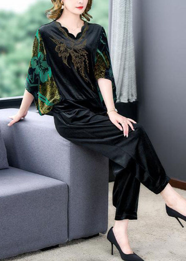 Modern Green V Neck Print Silk Velour Tops And Pants Two Pieces Set Batwing Sleeve