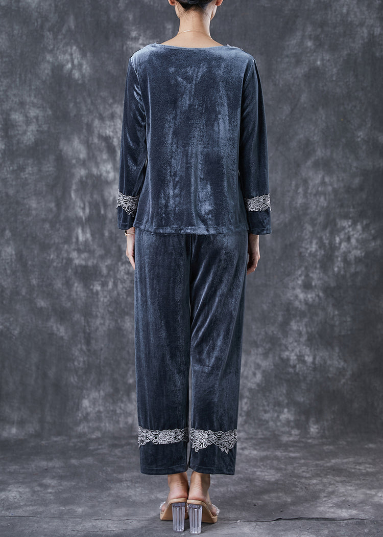 Modern Grey V Neck Lace Patchwork Silk Velour Two Pieces Set Fall