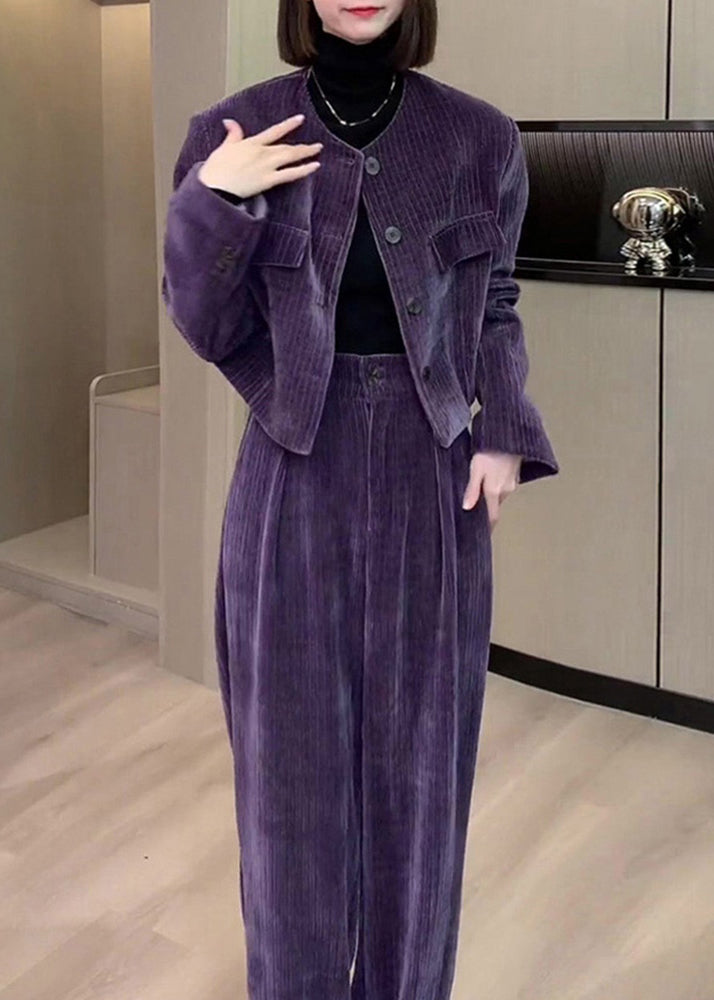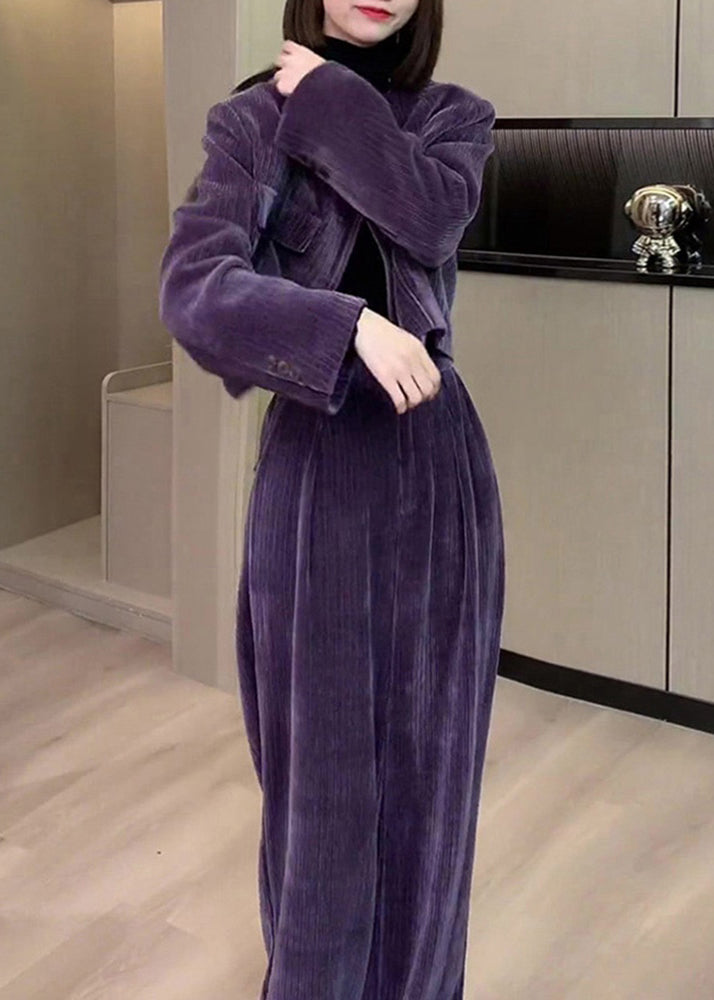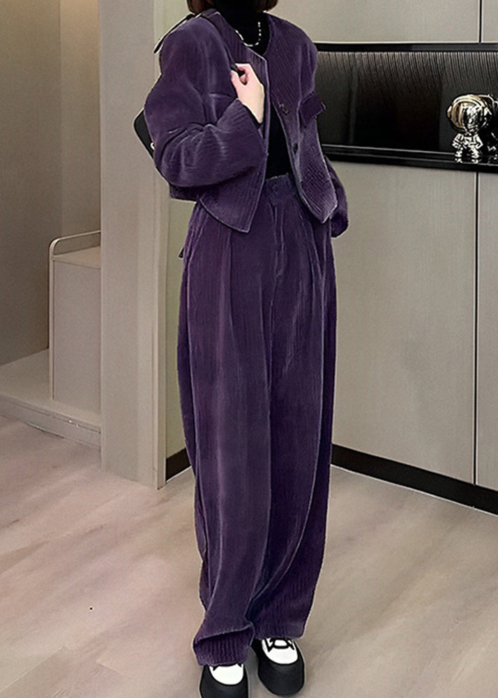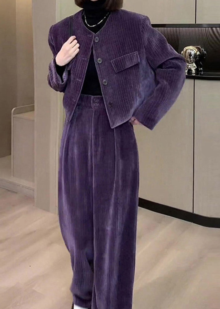 Modern Purple O-Neck Button Silk Velour Coats And Wide Leg Pants Two Pieces Set Fall