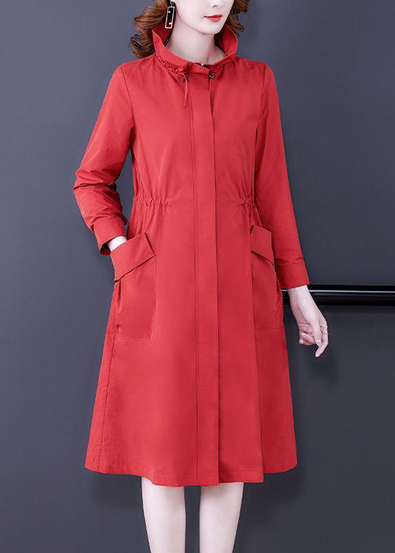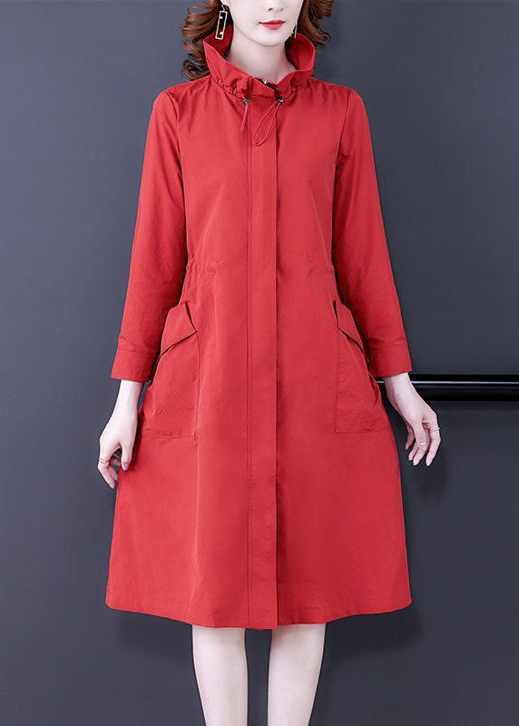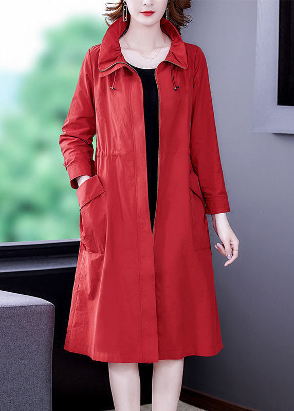 Modern Red Stand Collar Zip Up Silk Coat Outwear Long Sleeve