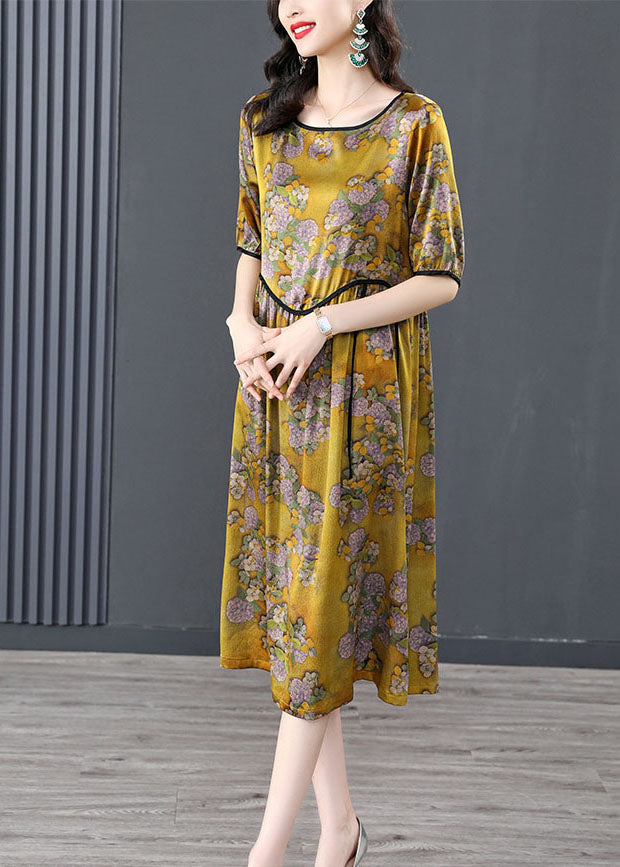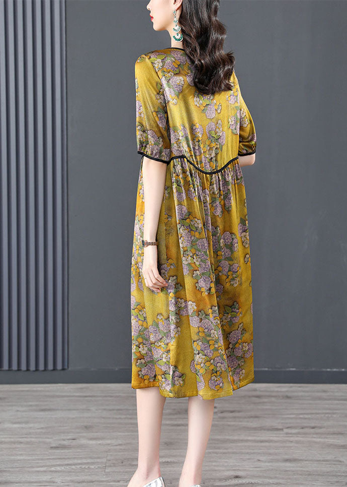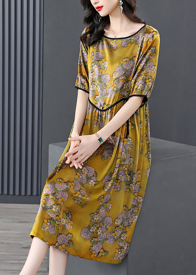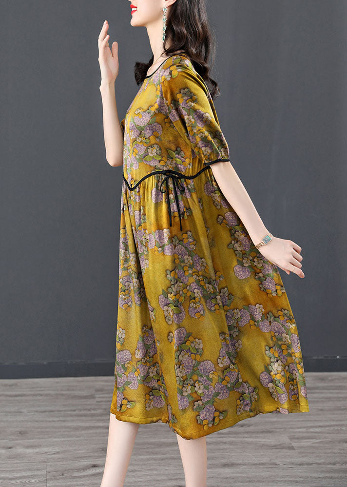 Modern Yellow O-Neck Wrinkled Asymmetrical Print Silk Vacation Dress Short Sleeve
