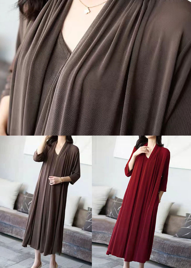 Mulberry Patchwork Silk Dress V Neck Wrinkled False Two Pieces Spring