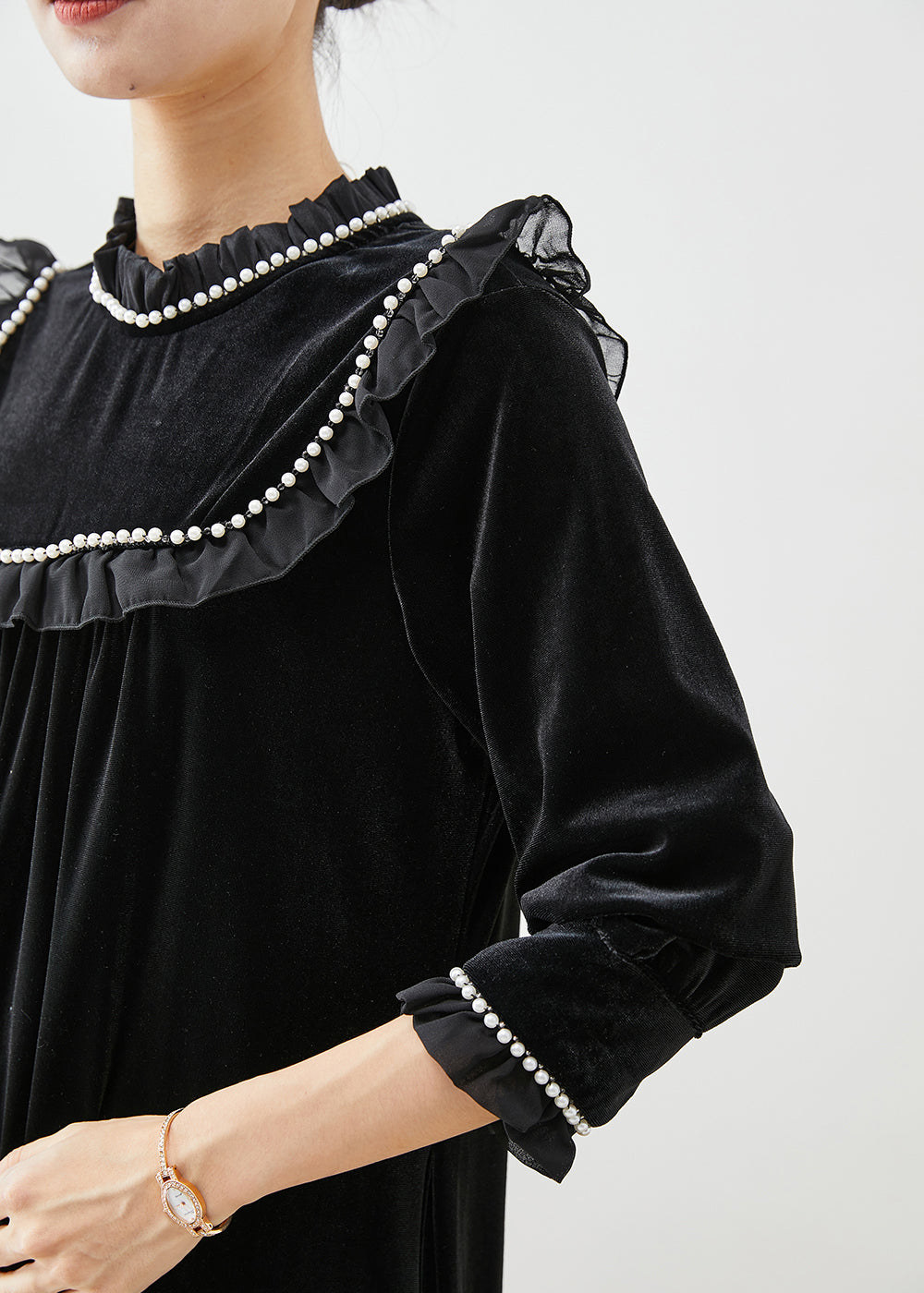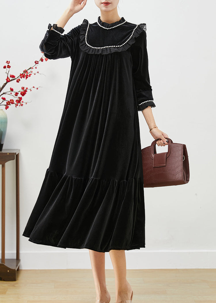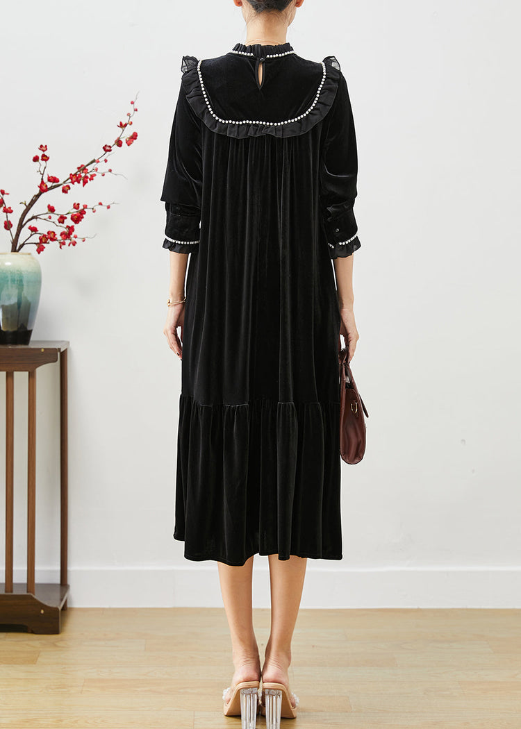 Natural Black Stand Collar Ruffled Patchwork Pearl Silk Velour Dress Fall