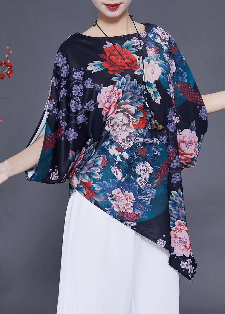 Navy Print Silk Blouse Top Asymmetrical Batwing Sleeve