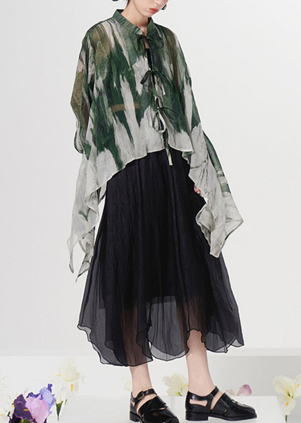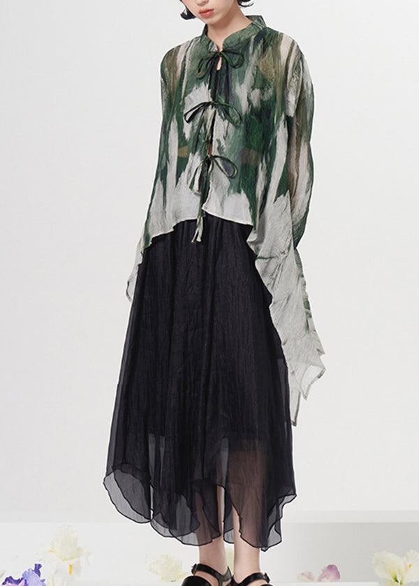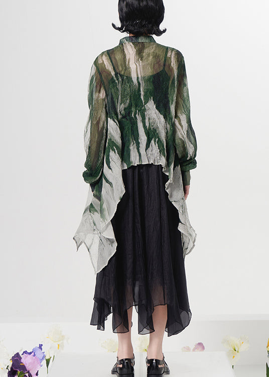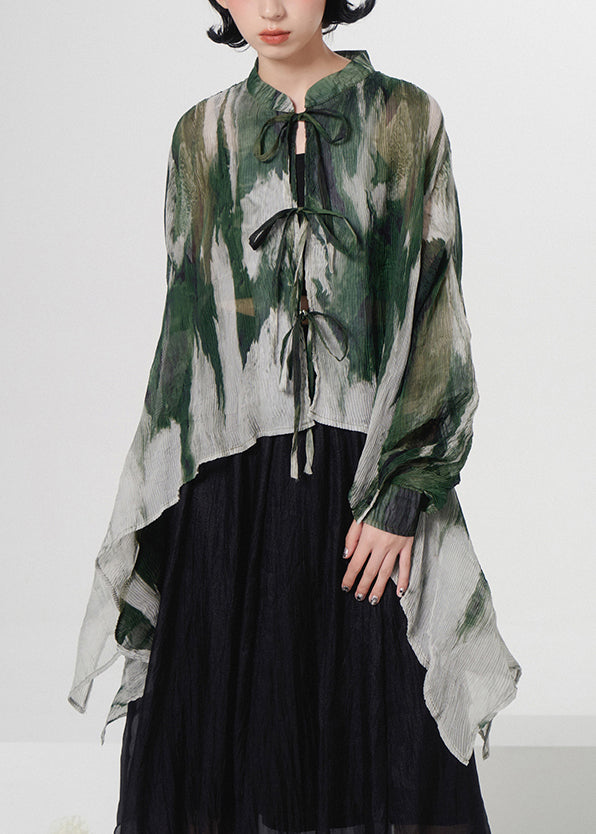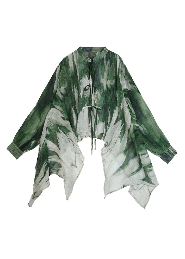 New Green Asymmetrical Lace Up Tie Dye Silk Shirt Tops Fall