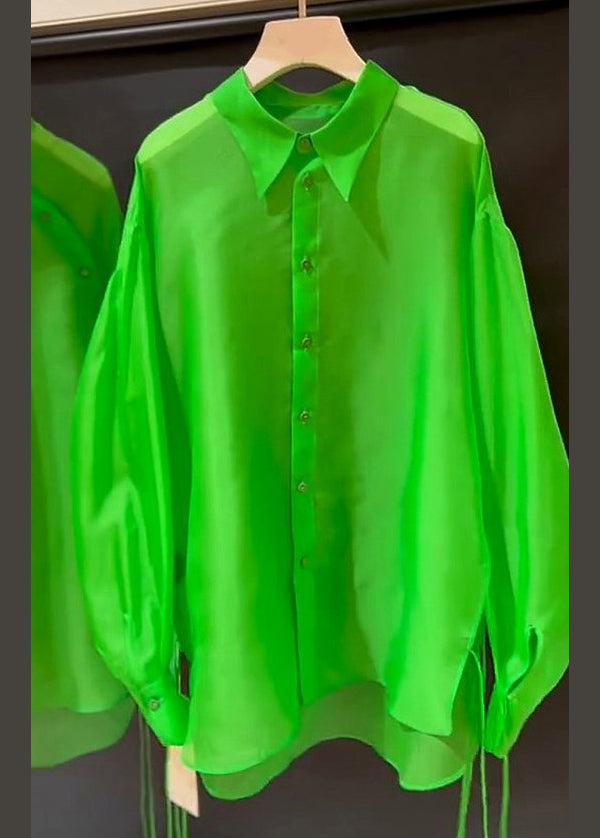 New Green Peter Pan Collar Button Patchwork Silk Shirt Fall