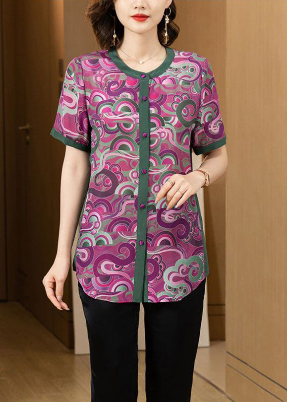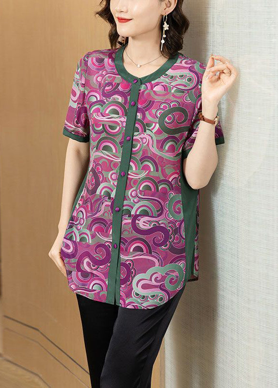 New Purple O Neck Print Button Patchwork Silk Shirt Summer