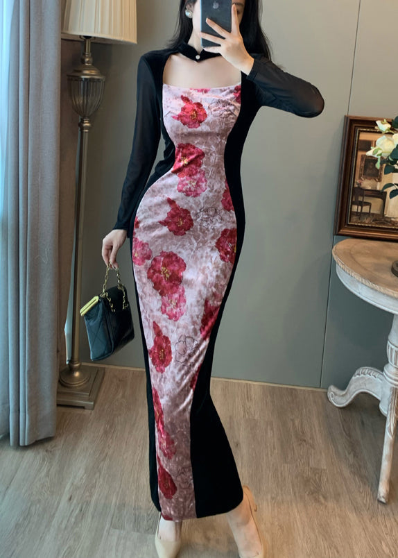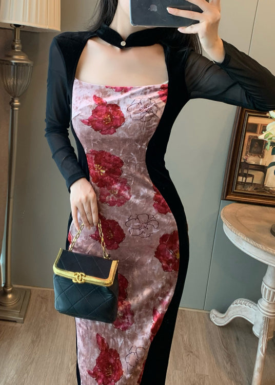 New Retro Pink Print Patchwork Silk Velvet Vacation Dresses Fall