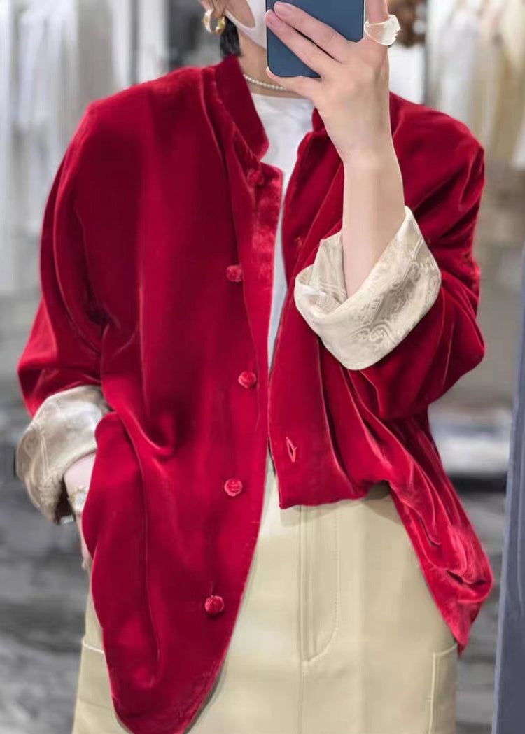 New Wine Red Button Patchwork Silk Velour Blouses Fall