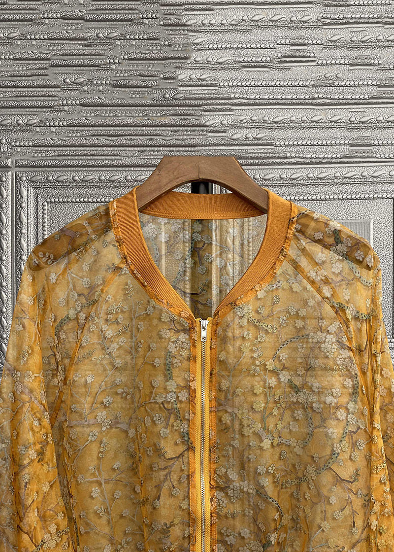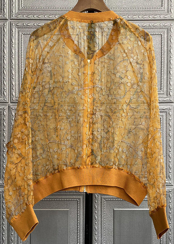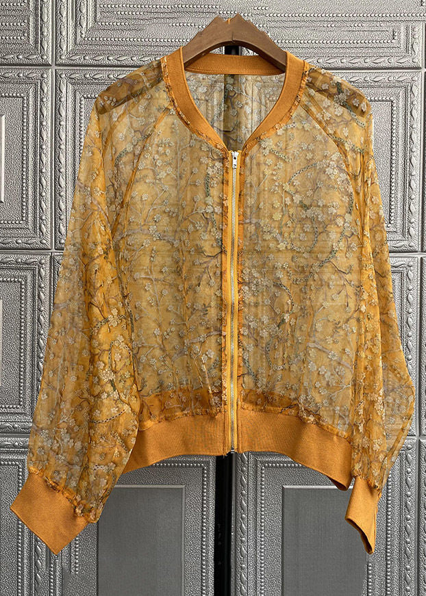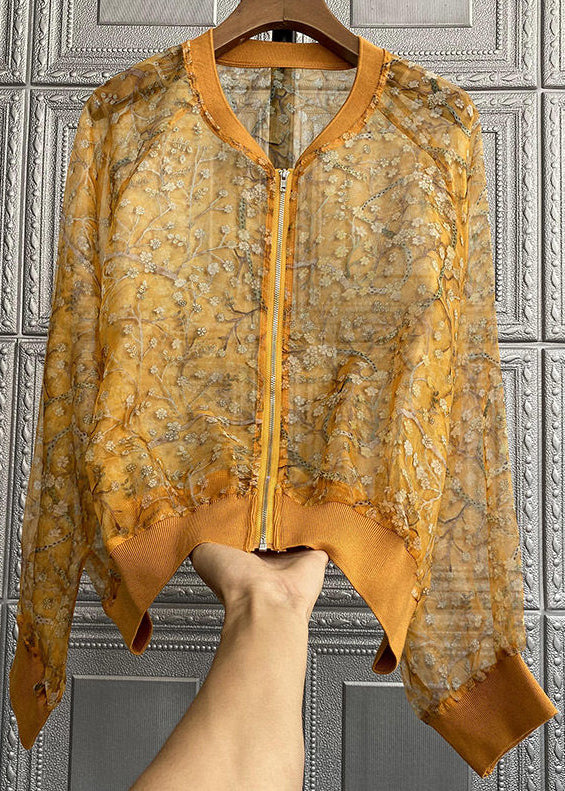 New Yellow Embroideried Zippered Patchwork Silk Thin Coats Long Sleeve