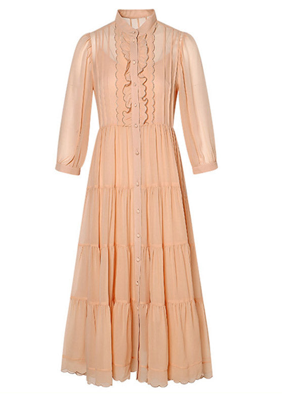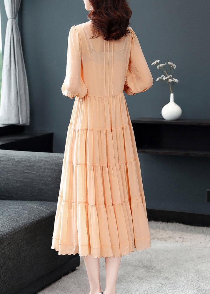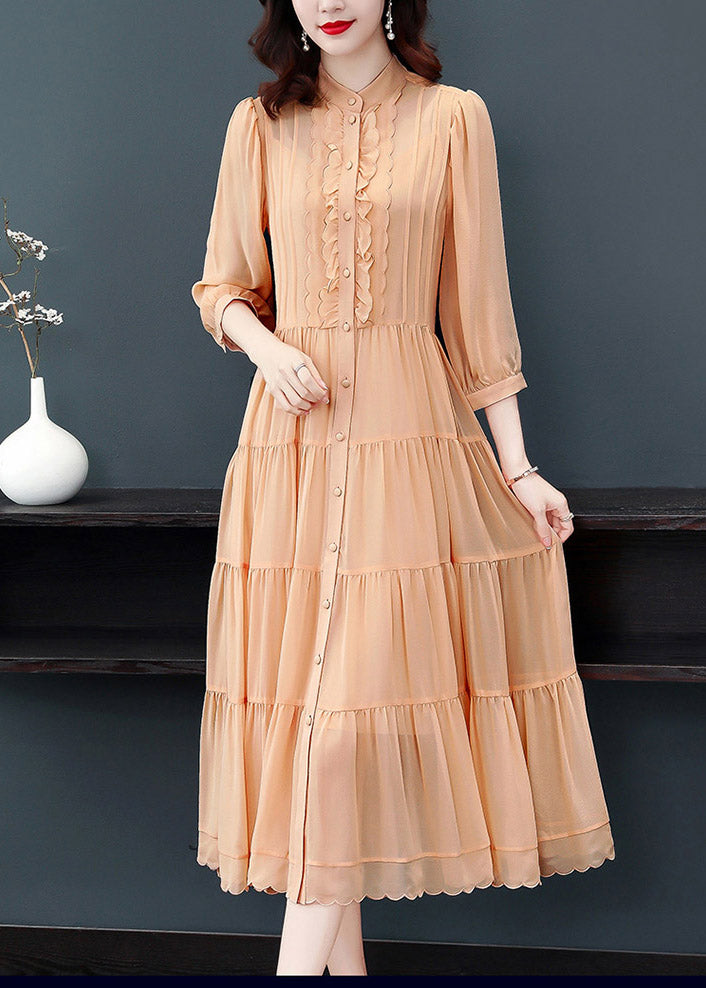 Orange Wrinkled Button Solid Silk Long Dress Lantern Sleeve
