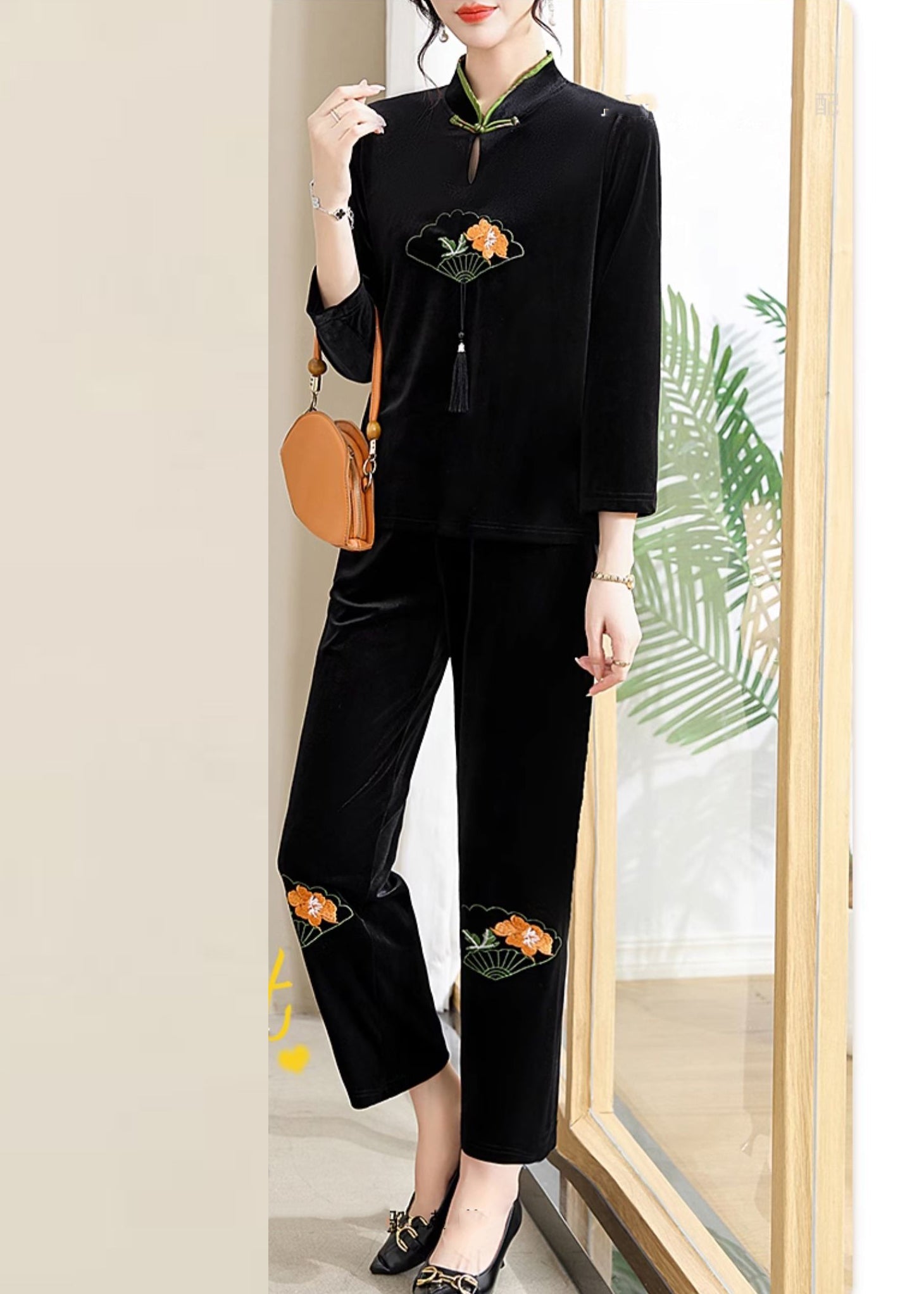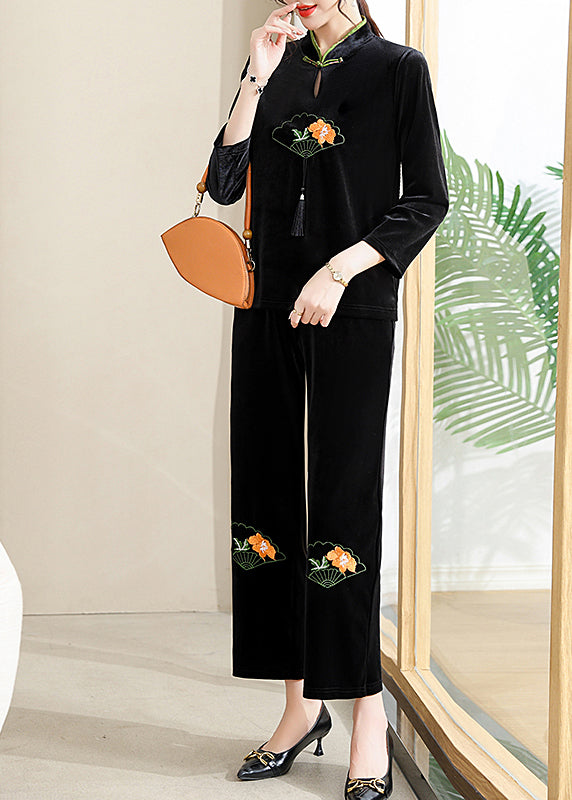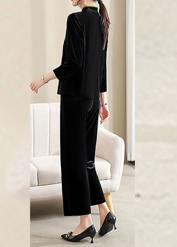 Organic Black Embroideried Button Silk Velour Two Piece Set Fall