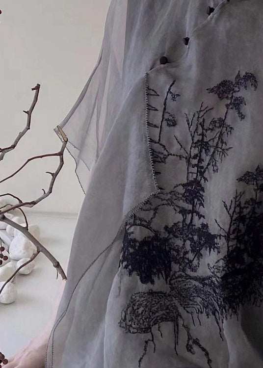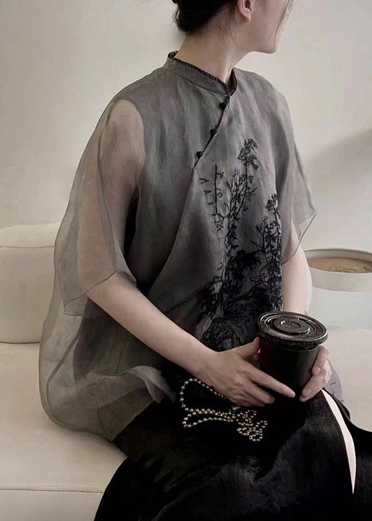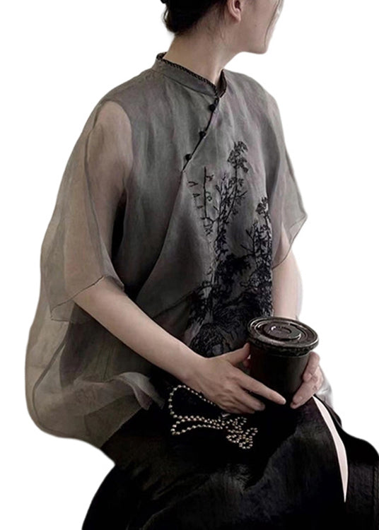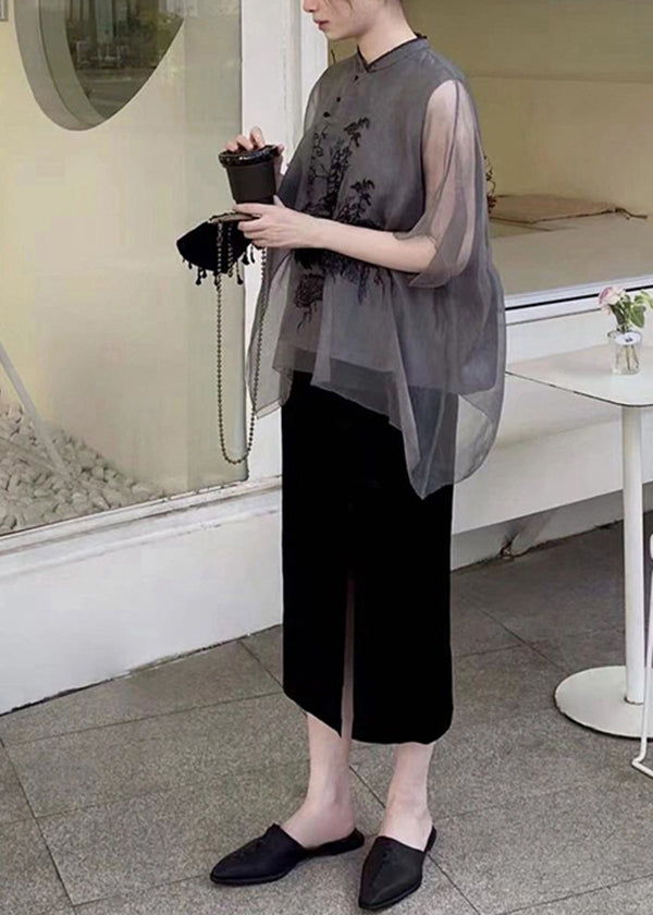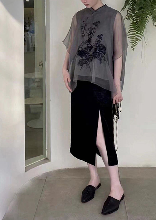 Organic Black Embroidered Patchwork Silk Shirts Tops Summer