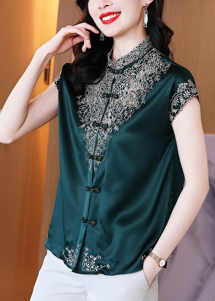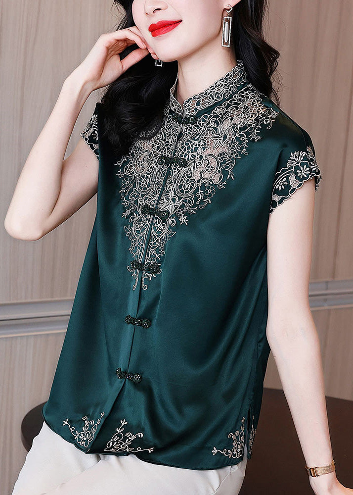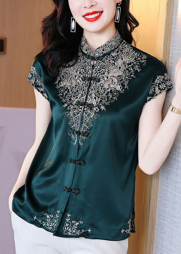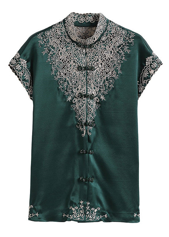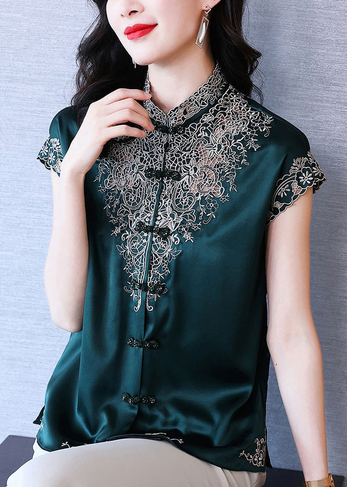 Organic Blackish Green Stand Collar Embroideried Hollow Out Button Silk Top Short Sleeve