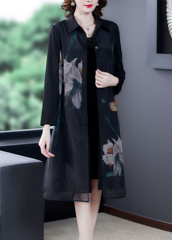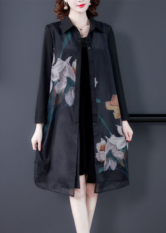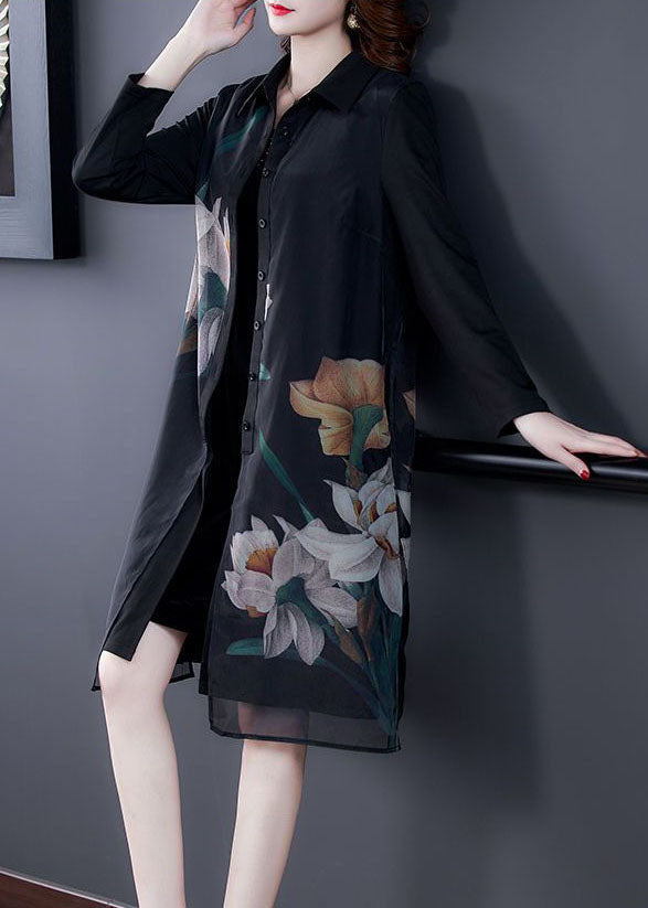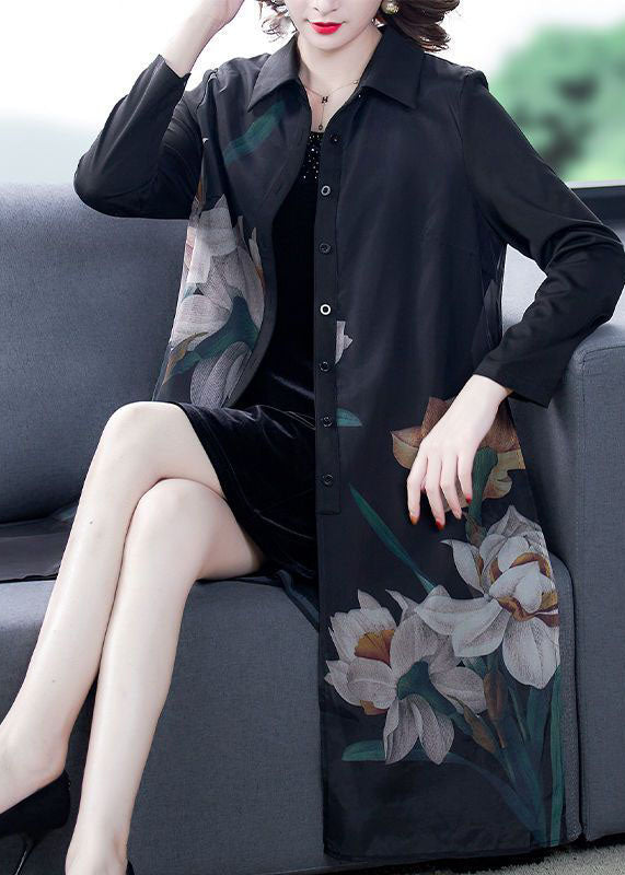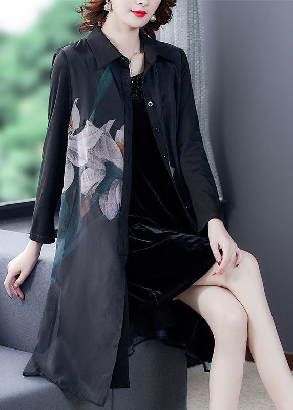 Original Design Black Peter Pan Collar Print Silk Shirt Coat Long Sleeve