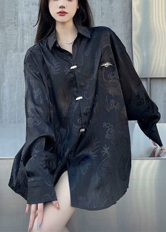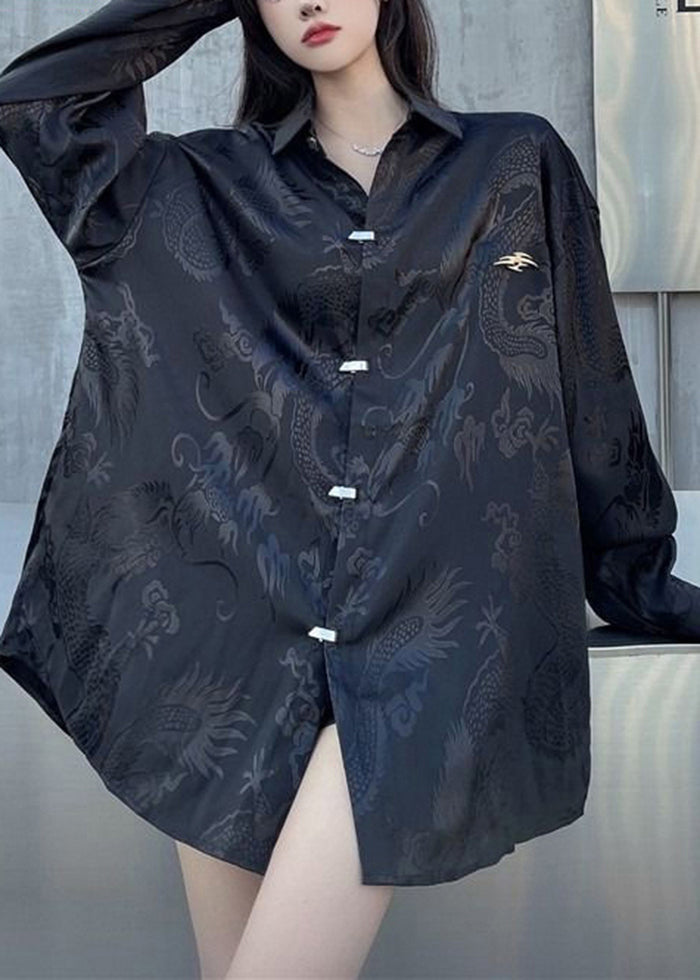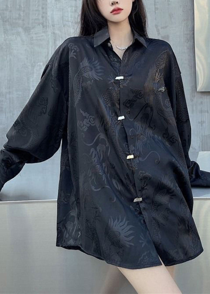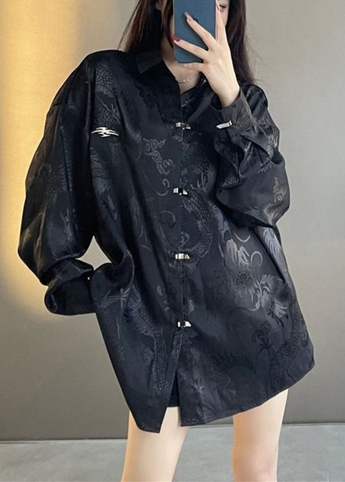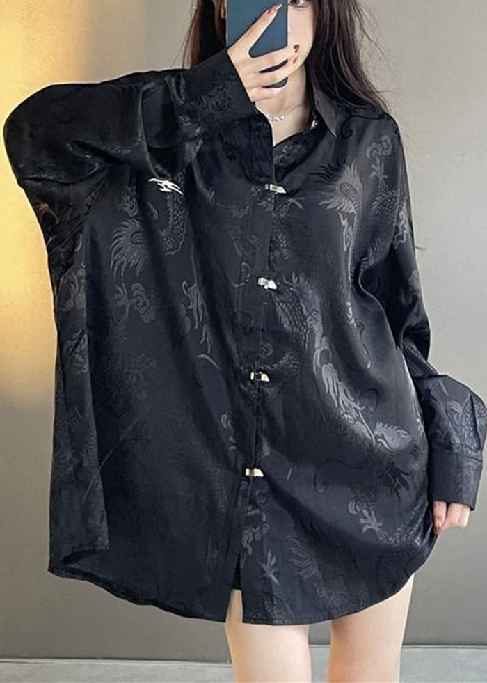 Plus Size Black Oversized Jacquard Silk Shirt Tops Fall