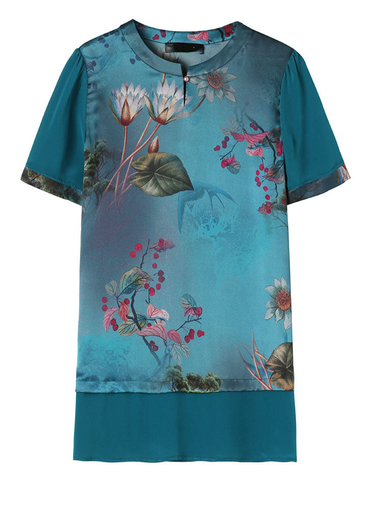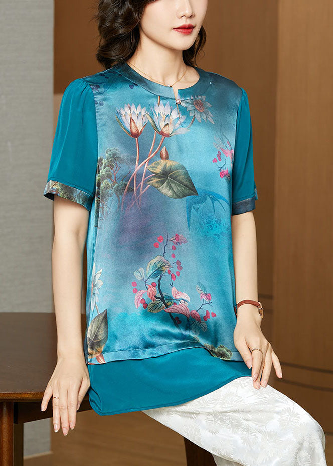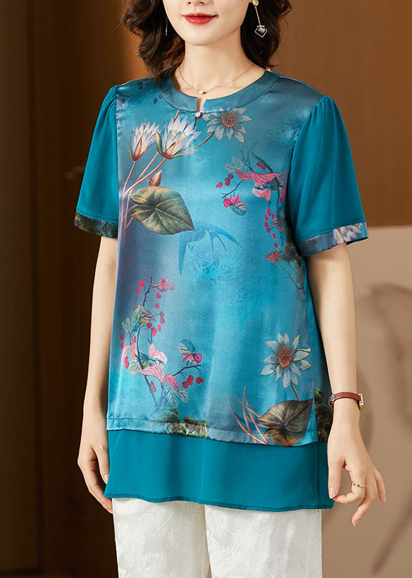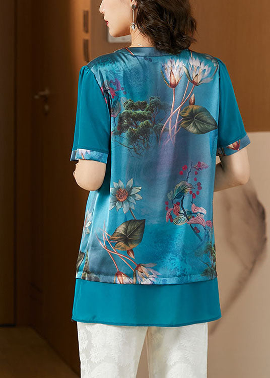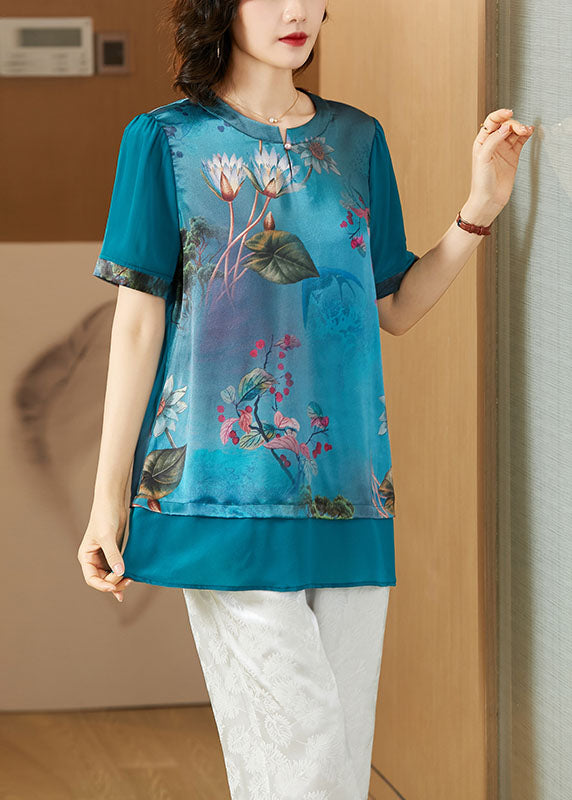 Plus Size Blue O-Neck Patchwork Print Silk Tank Tops Short Sleeve