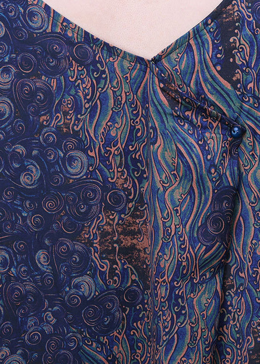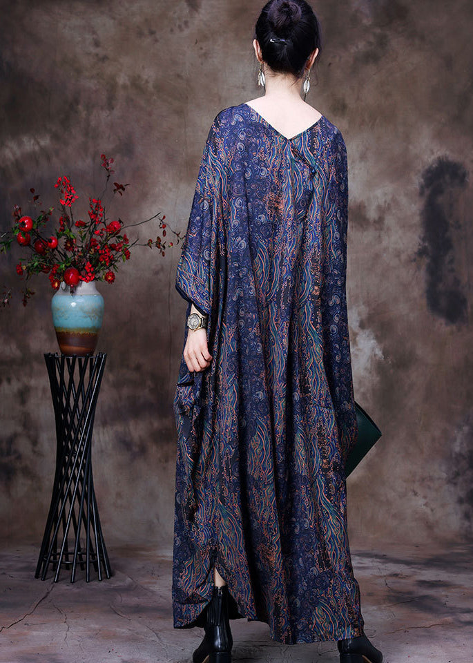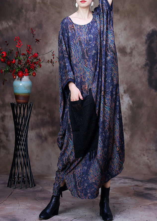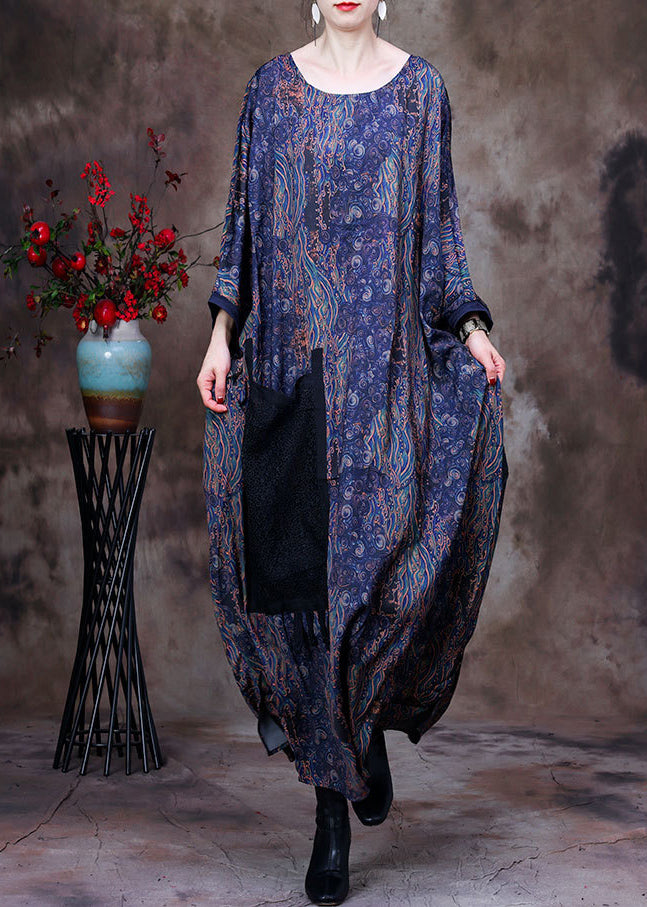 Plus Size Blue O-Neck Print Big Pocket Silk Ankle Dress Long Sleeve