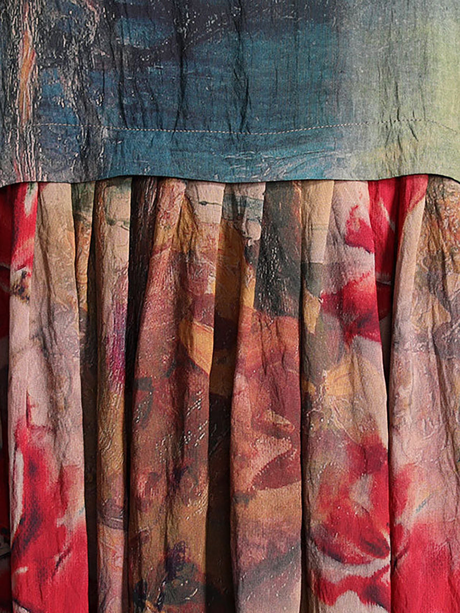 Plus Size Flower Printed Retro Split Hem Silk Dress
