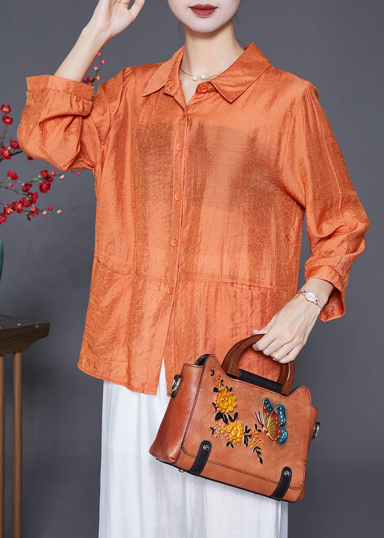 Plus Size Orange Oversized Patchwork Linen Silk Shirt Top Fall