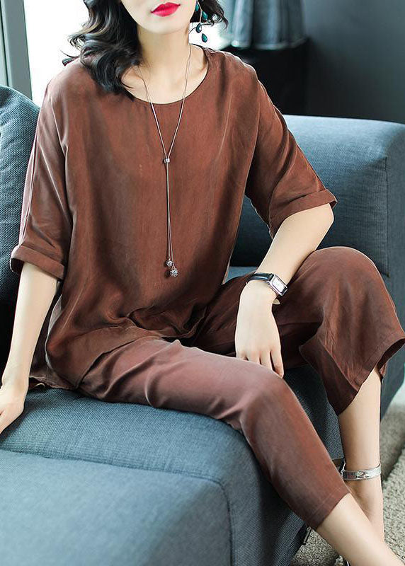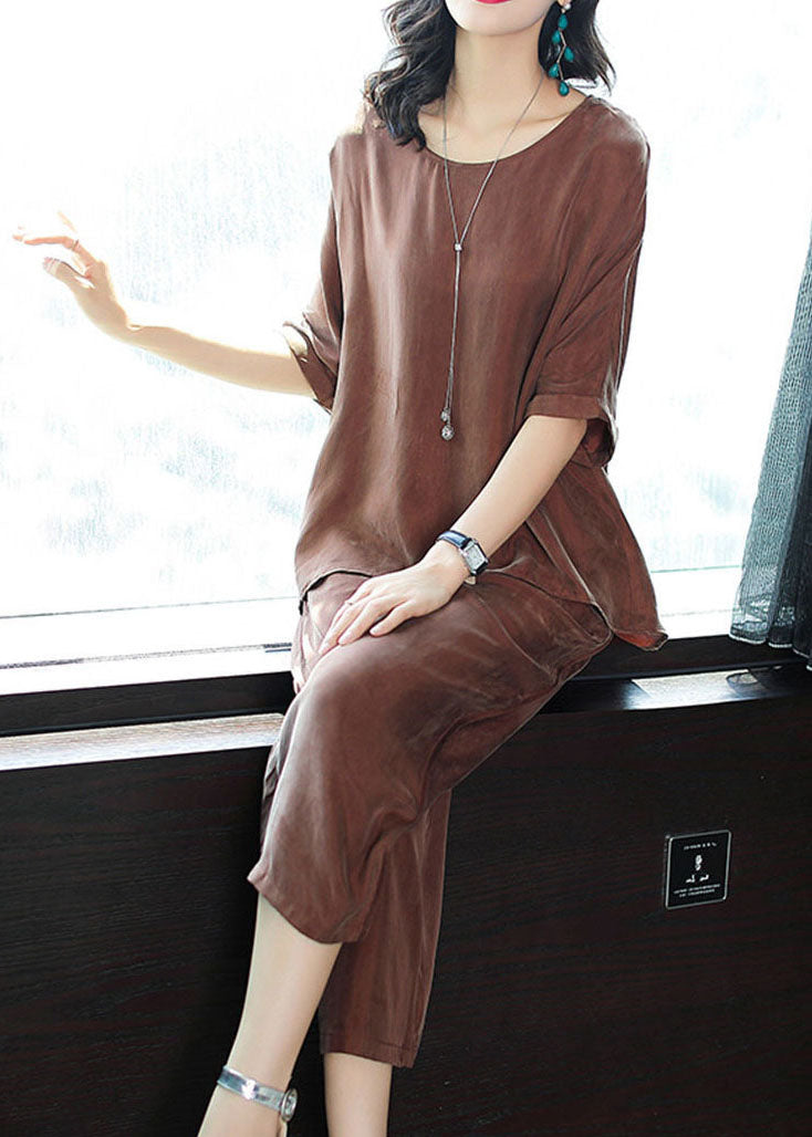 Plus Size Yellow O-Neck Tops And Pants Silk Two Pieces Set Summer