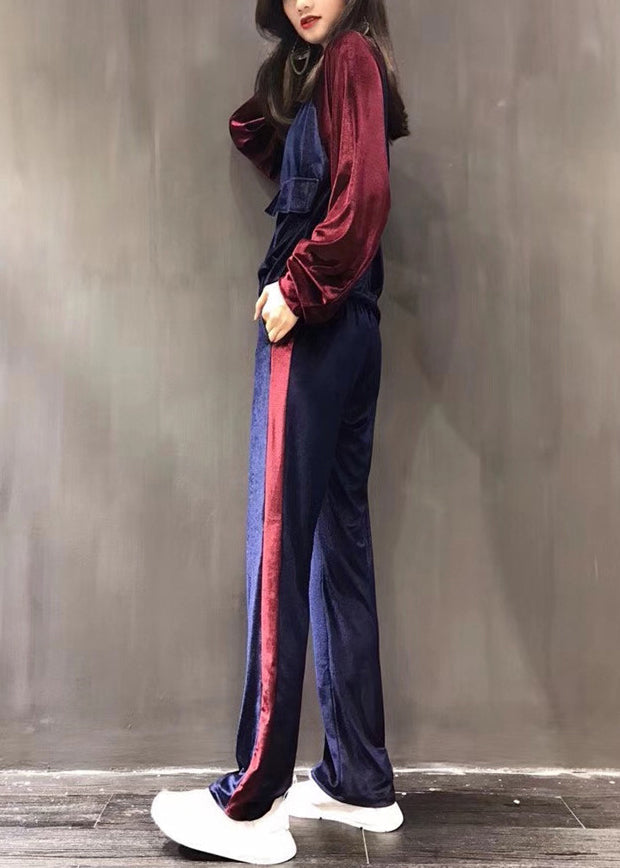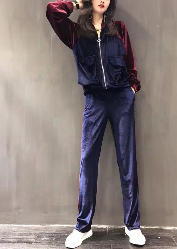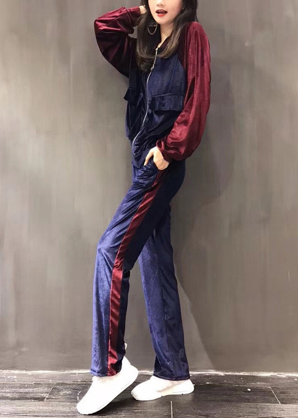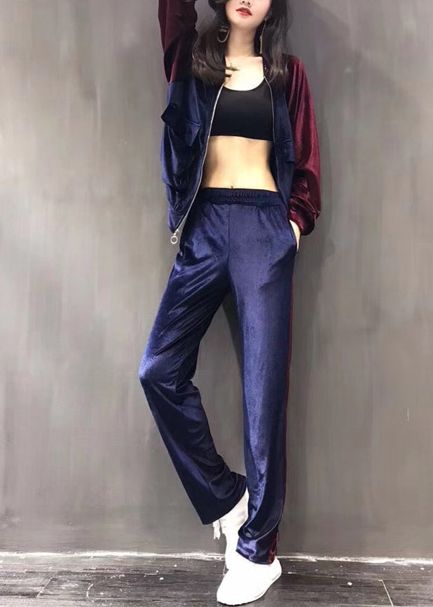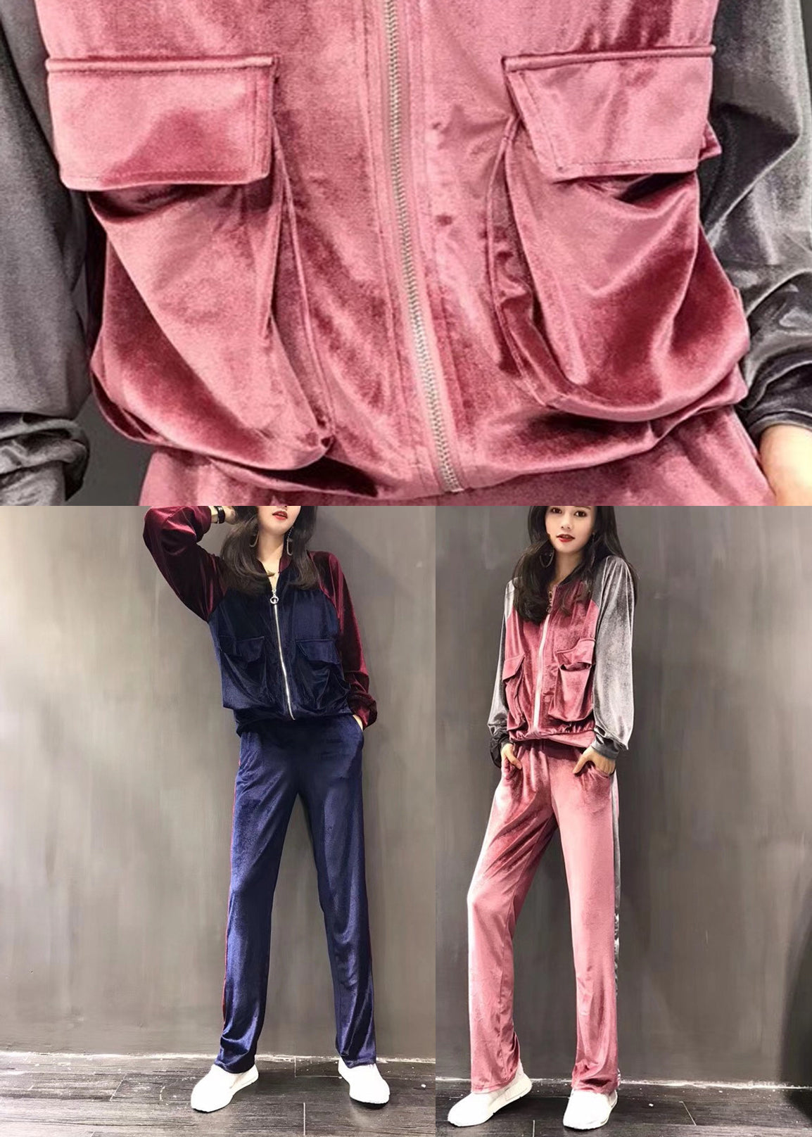 Purple Stand Collar Silk Velour Coats And Wide Leg Pants Two Pieces Set Fall