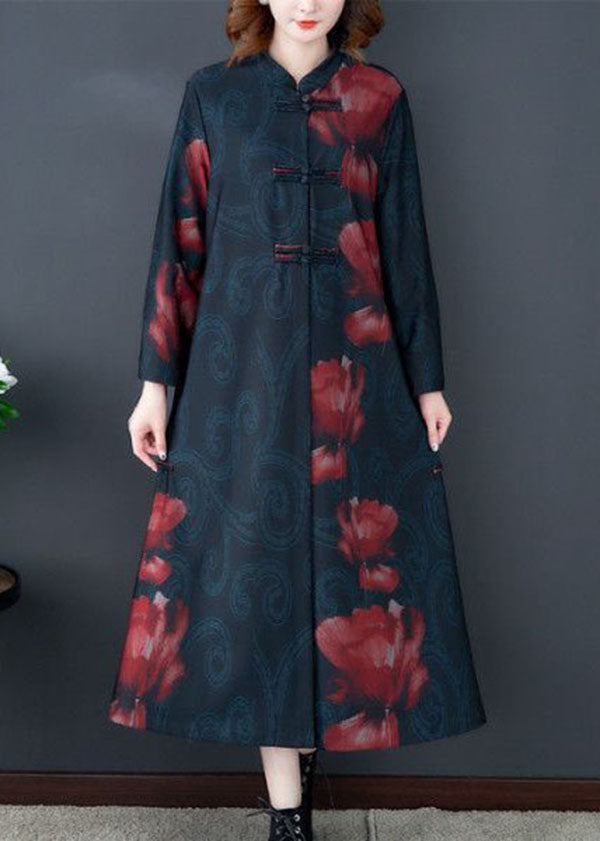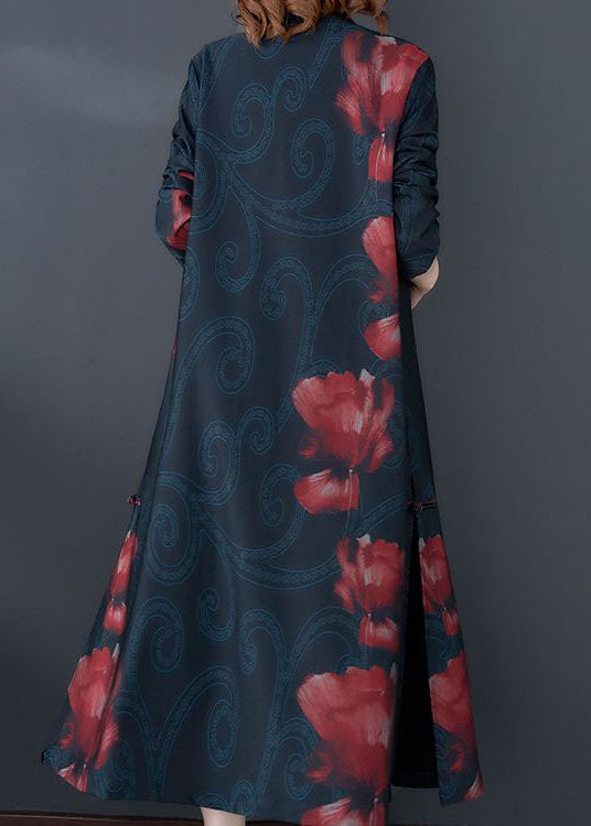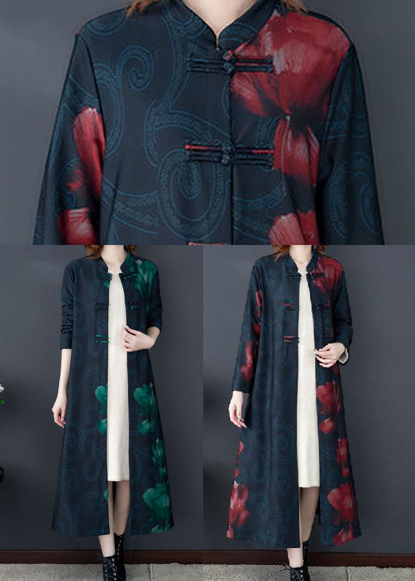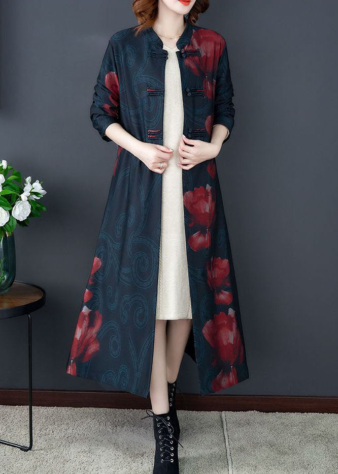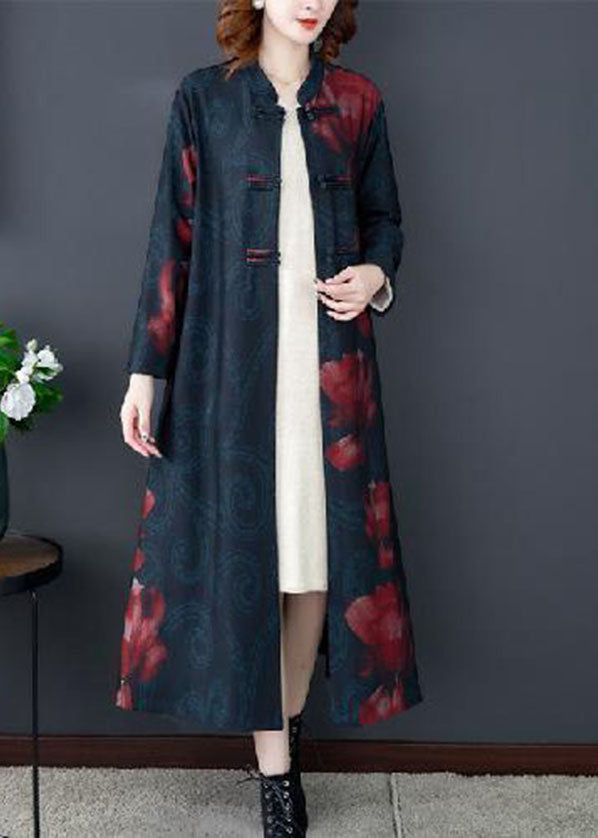 Red Print Silk Long Trench Coats Stand Collar Oriental Button Long Sleeve