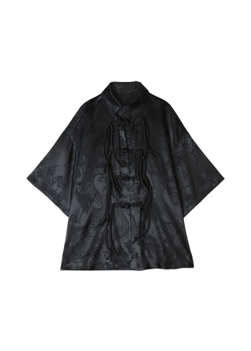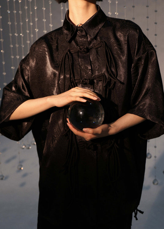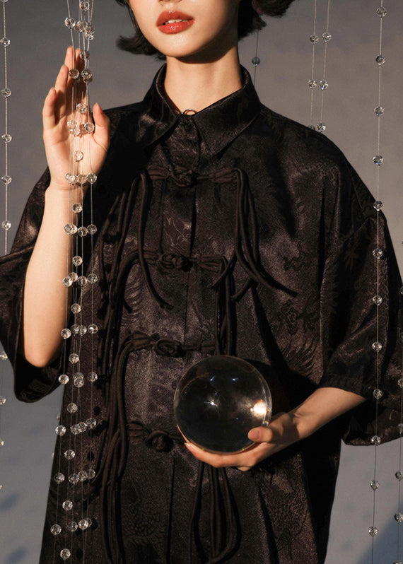 Retro Black Chinese Button Tasseled Patchwork Silk Shirt Tops Summer