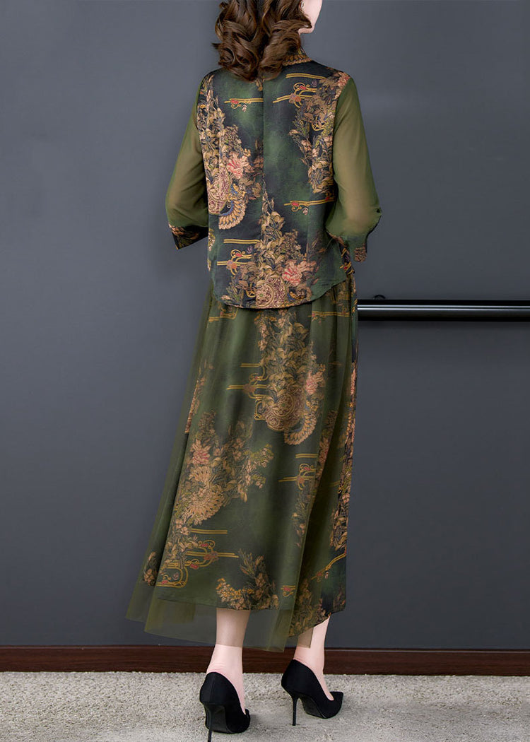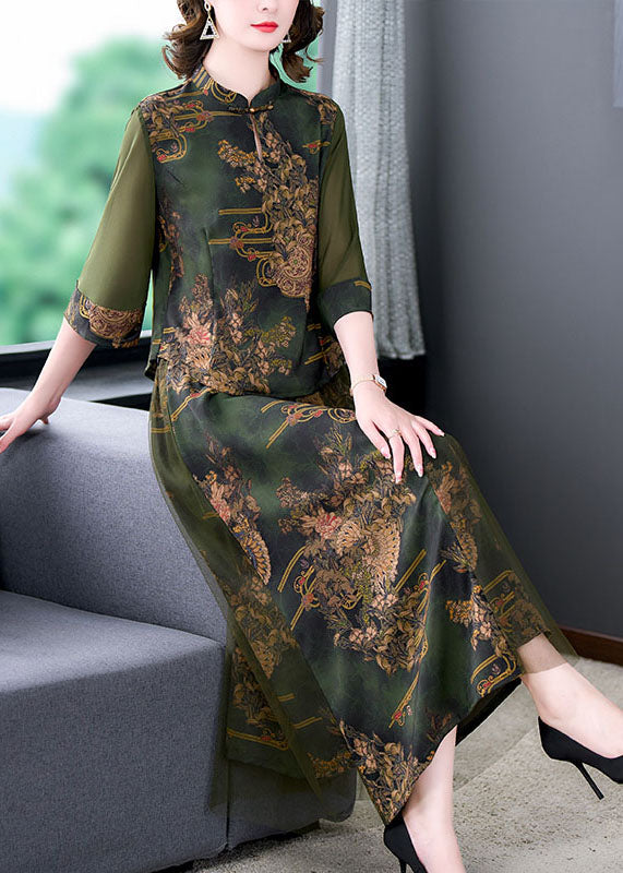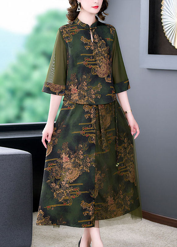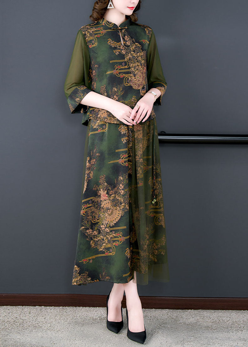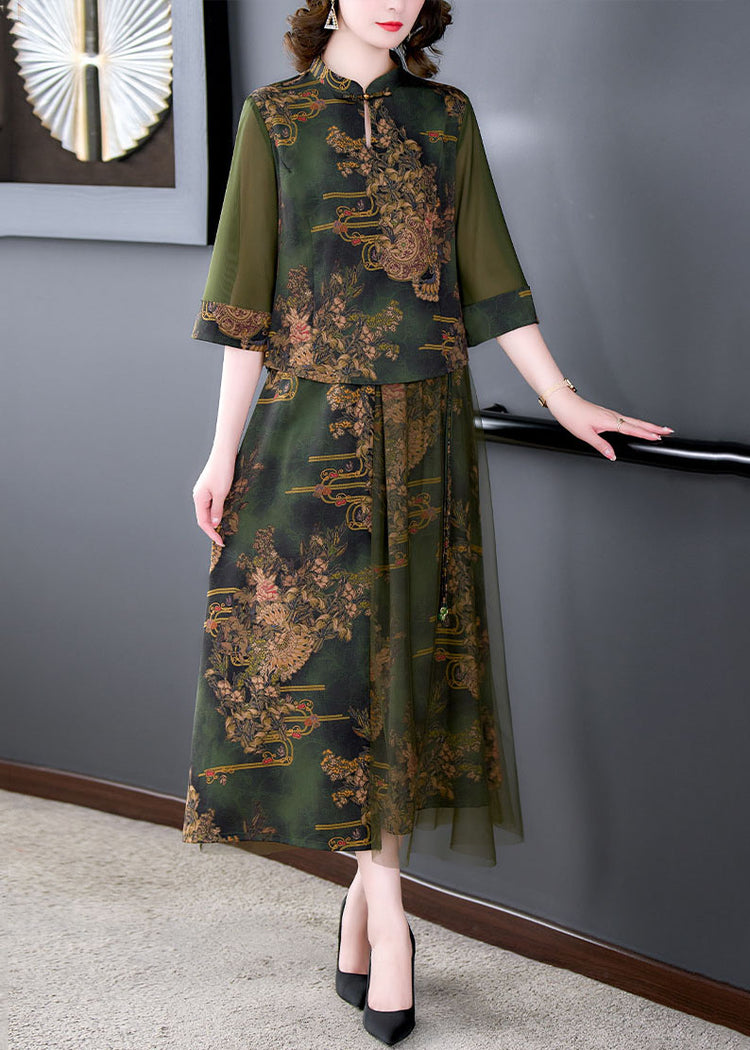 Retro Green Stand Collar Print Tops And Skirts Patchwork Silk Two Piece Set Summer