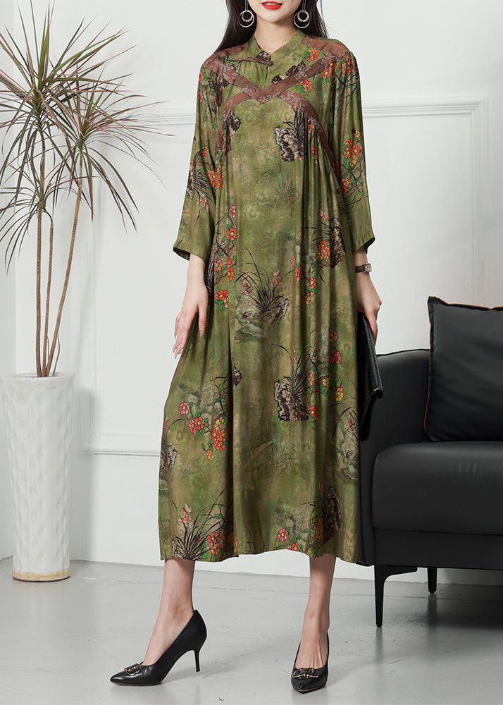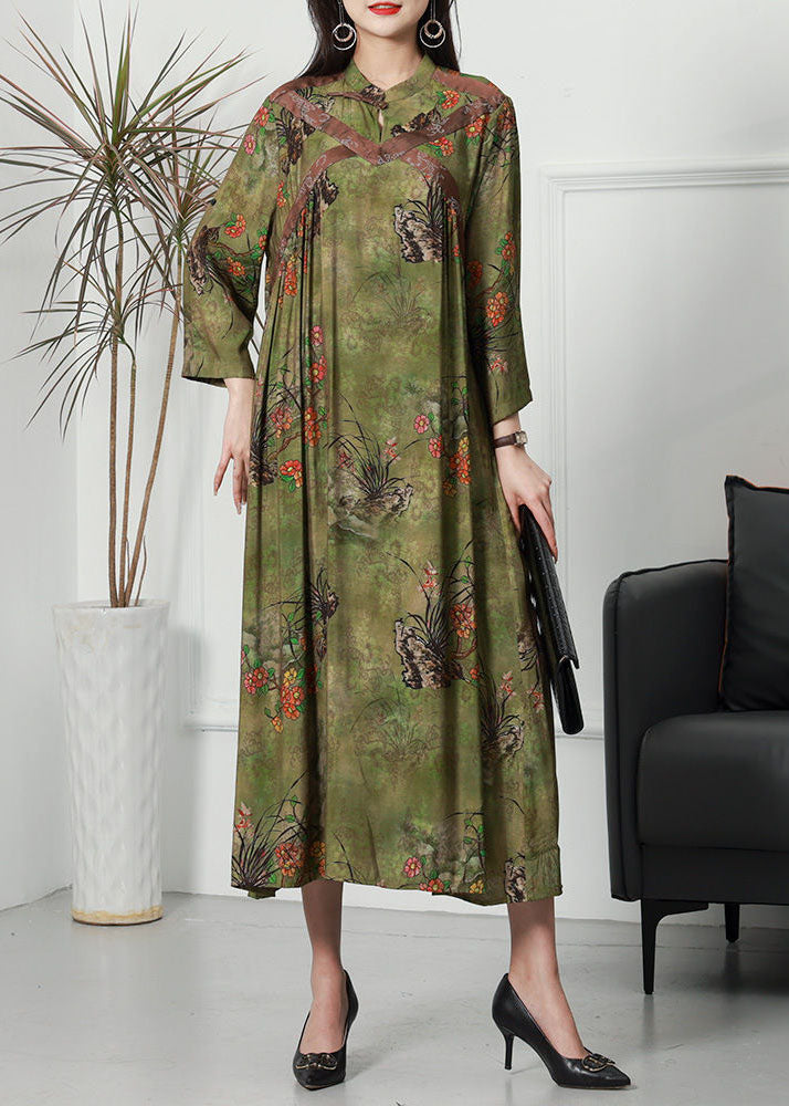Retro Green Stand Collar Print Wrinkled Long Silk Dress Spring