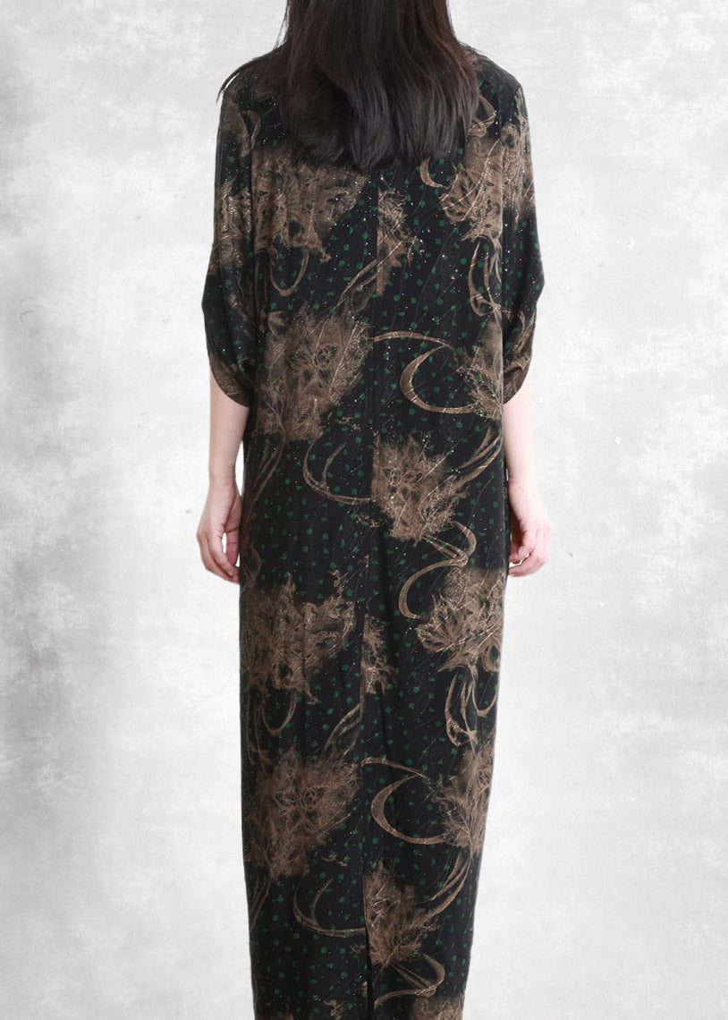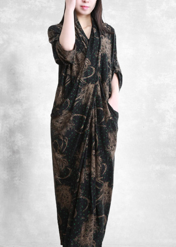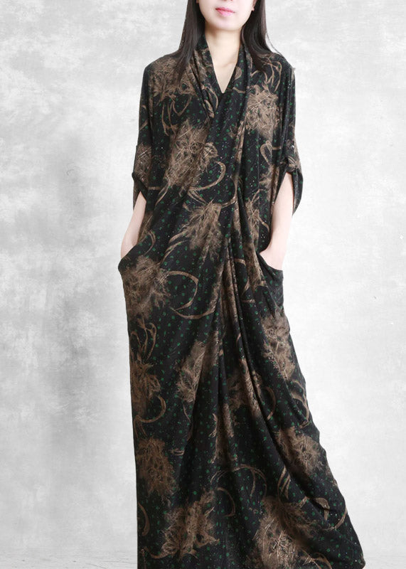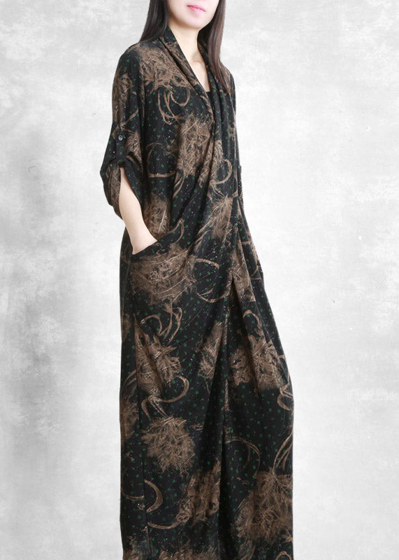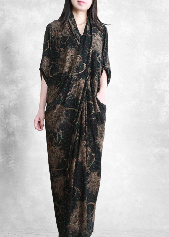 Retro V Neck Asymmetrical Print Pockets draping Silk Dress Half Sleeve