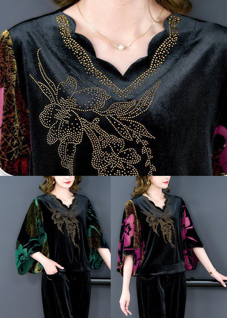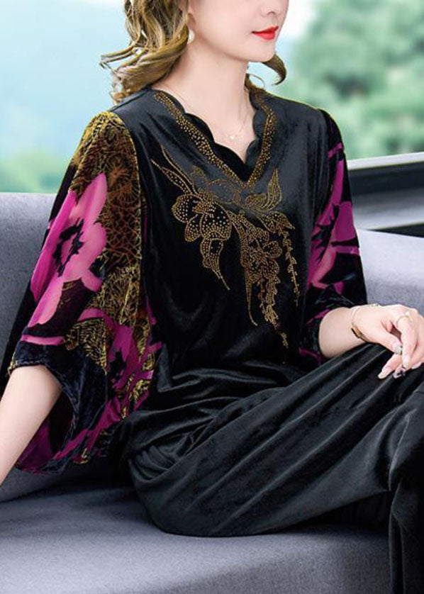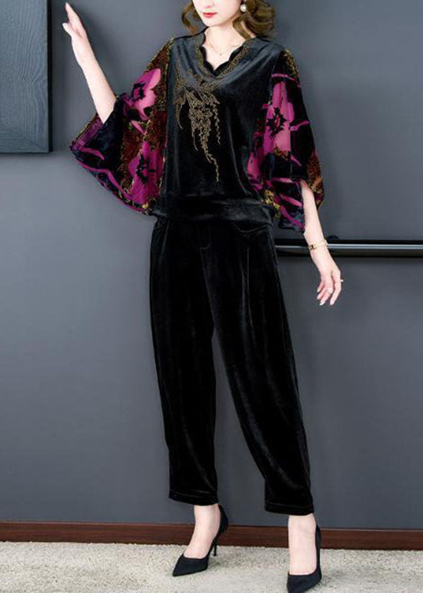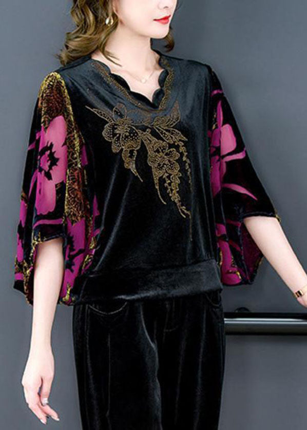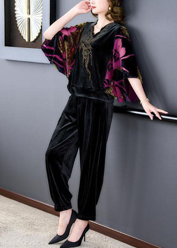 Rose Print Silk Velour Tops And Pants Two Pieces Set V Neck Batwing Sleeve