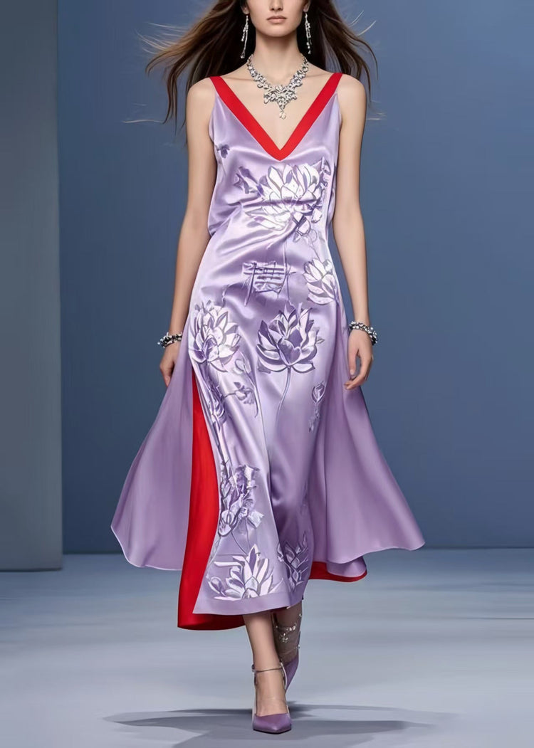 Style Lavender Print Side Open Silk Vacation Dresses Sleeveless