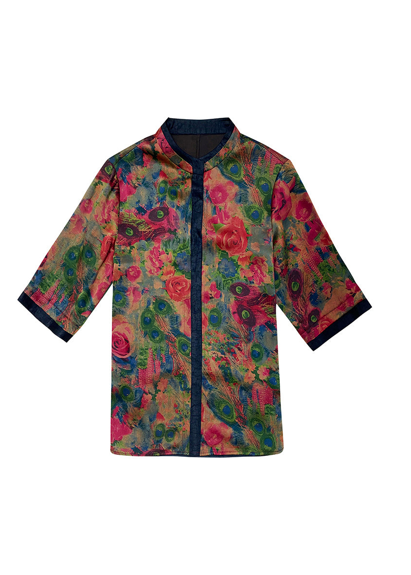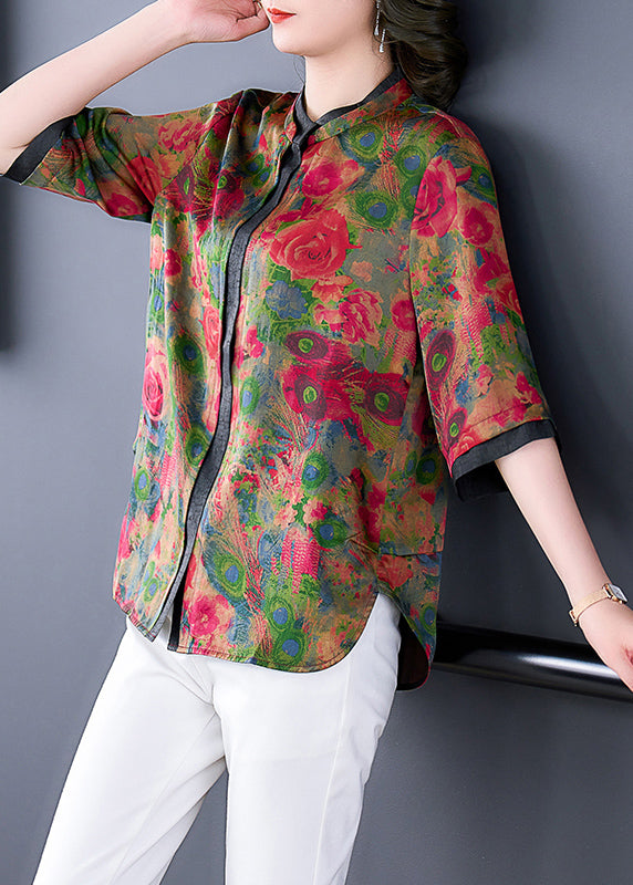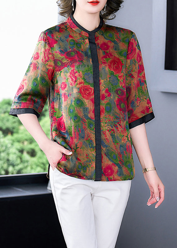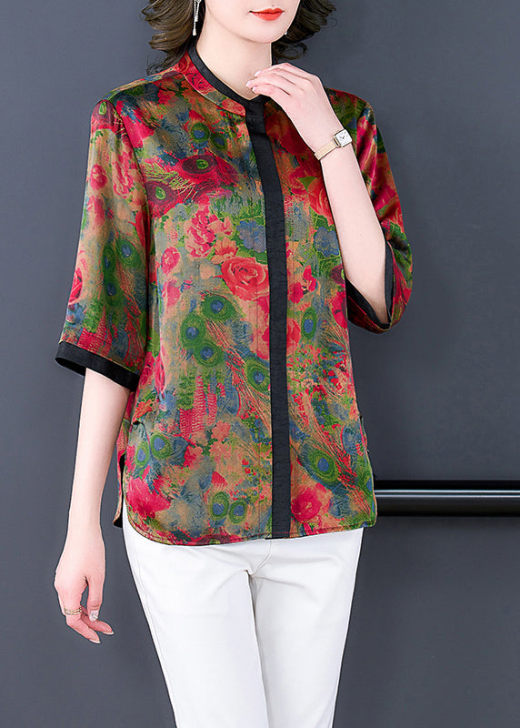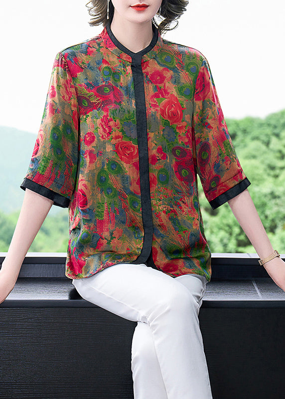 Style Red Stand Collar Patchwork Floral Print Silk Blouses Half Sleeve