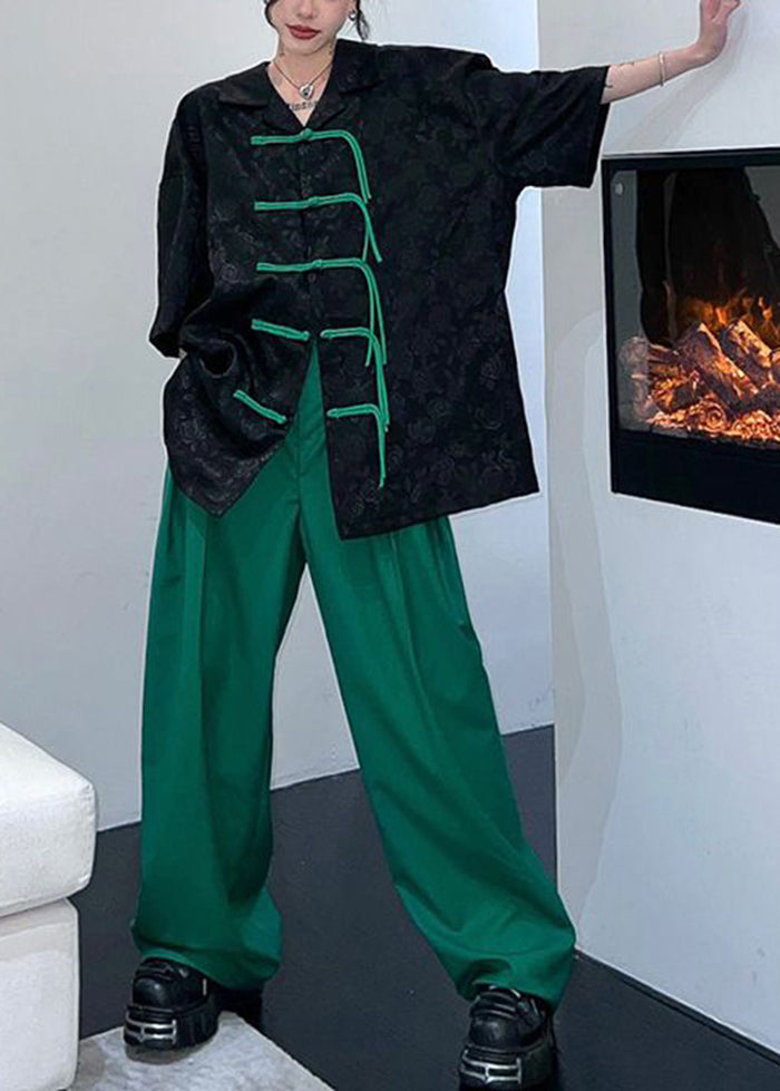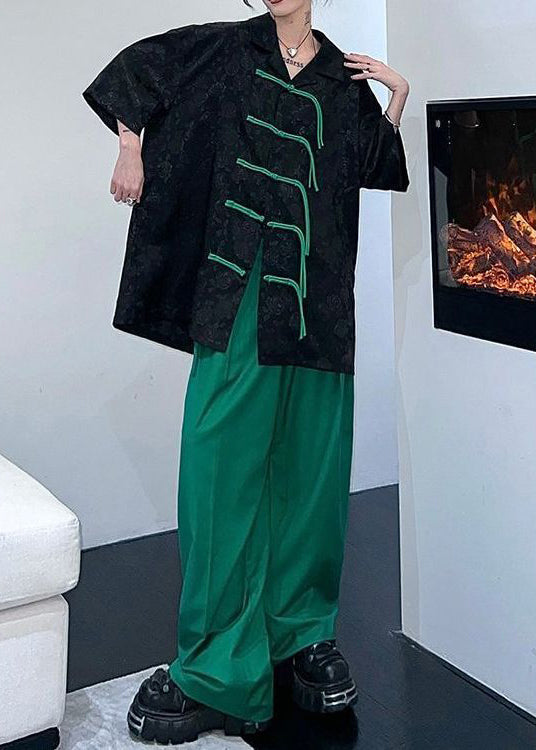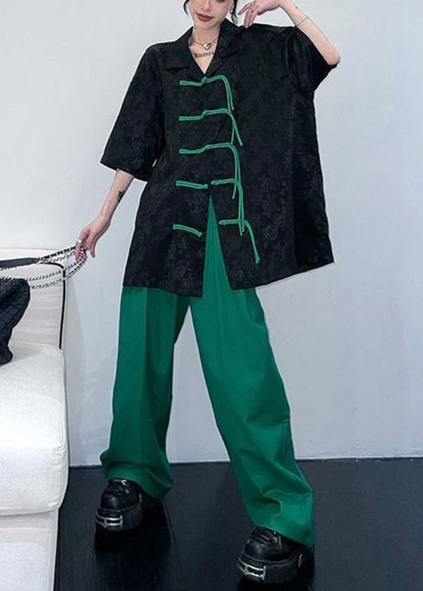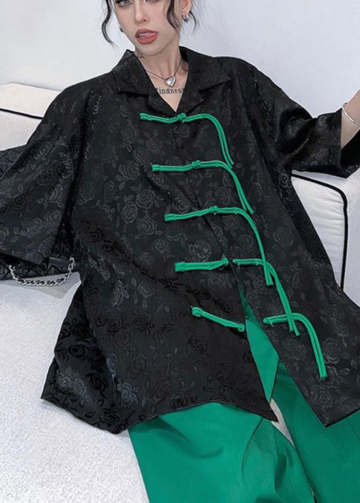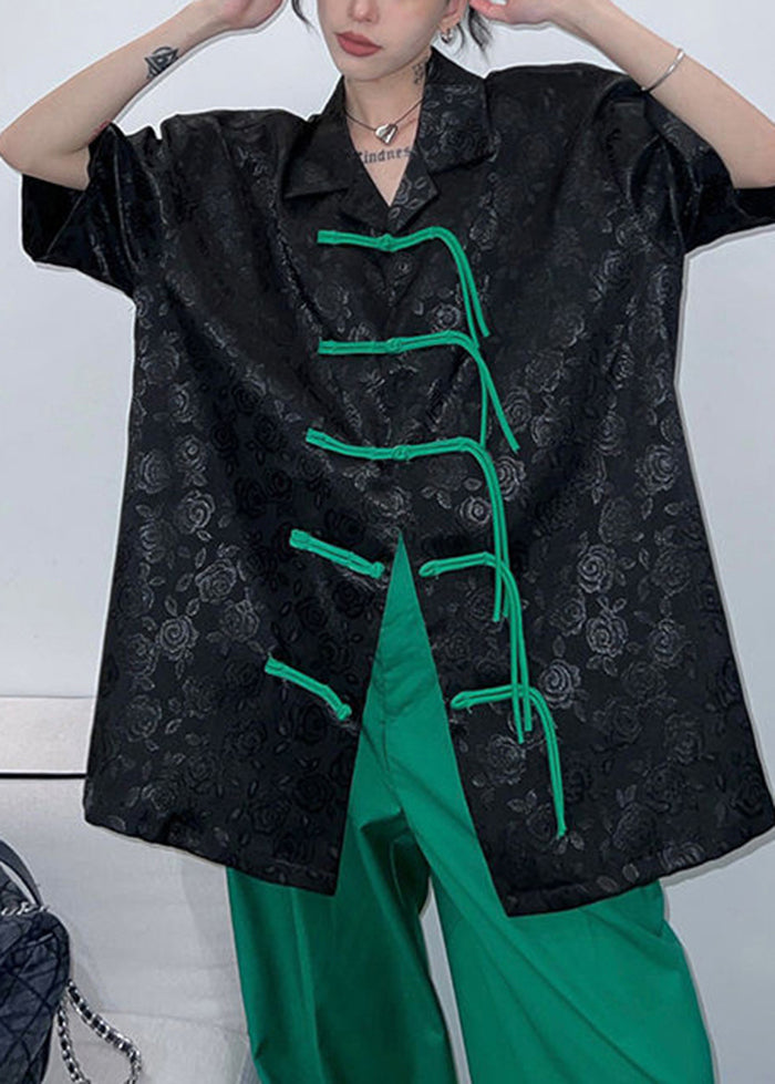 Stylish Black Tasseled Chinese Button Silk Shirt Tops Short Sleeve