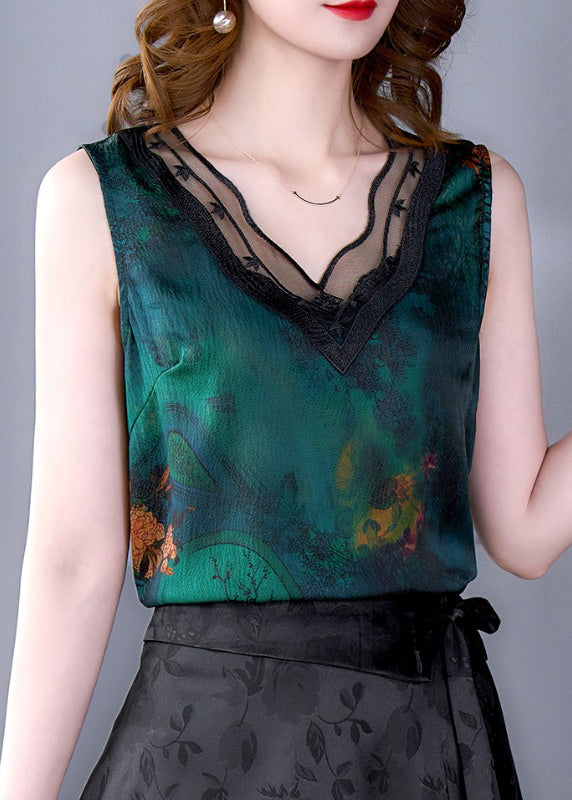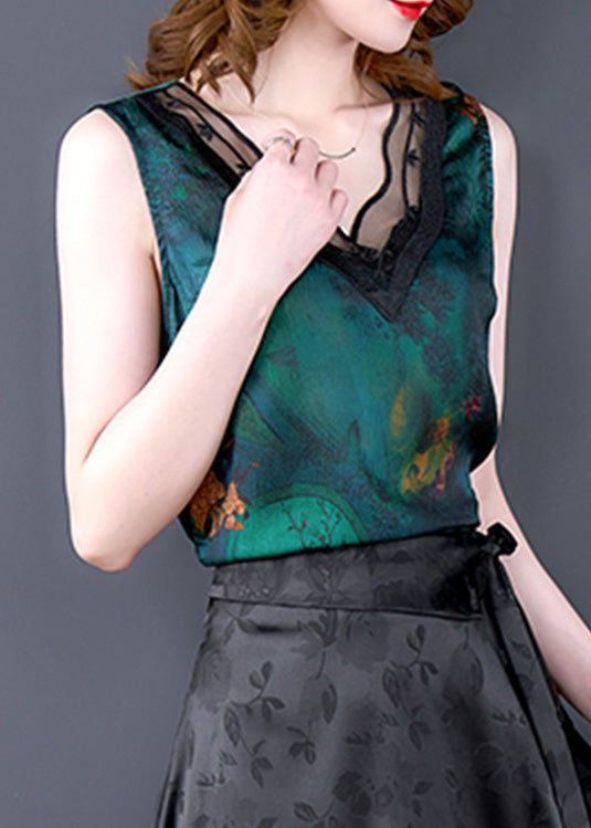 Stylish Blue V Neck Print Tulle Patchwork Silk Tank Top Summer