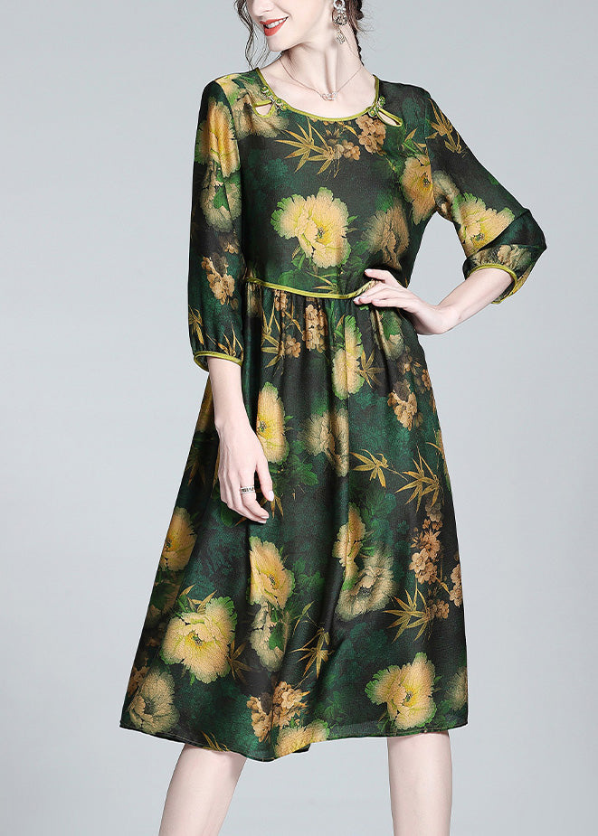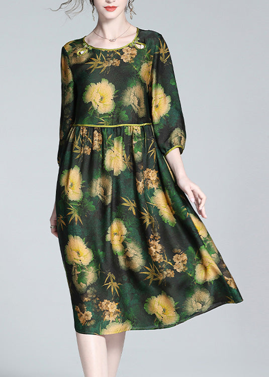 Stylish Green O-Neck Print Wrinkled Silk Long Dresses Spring