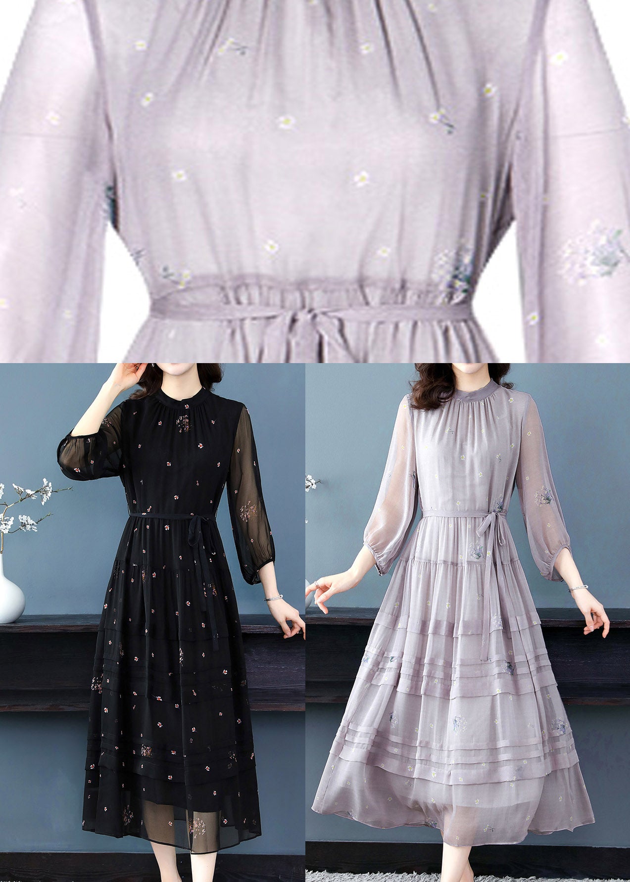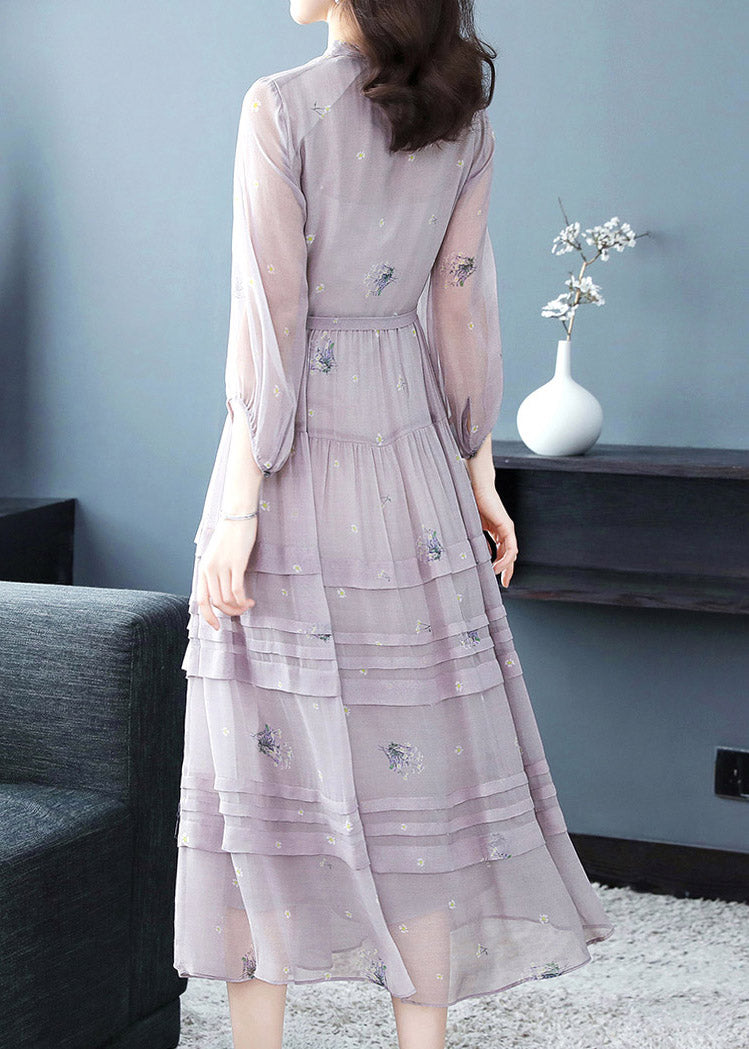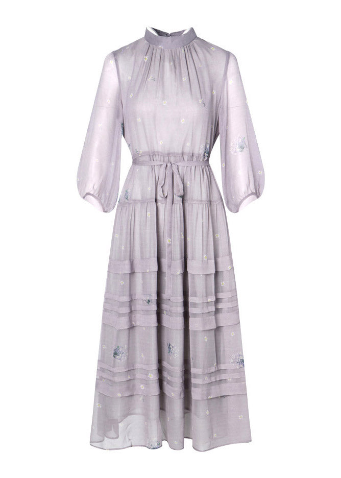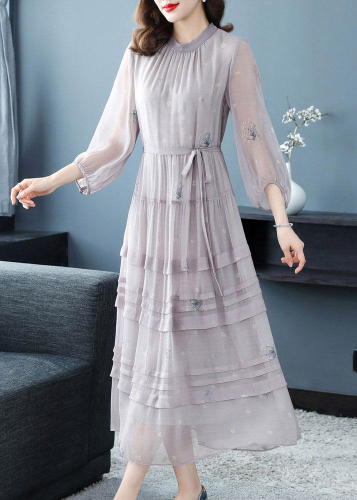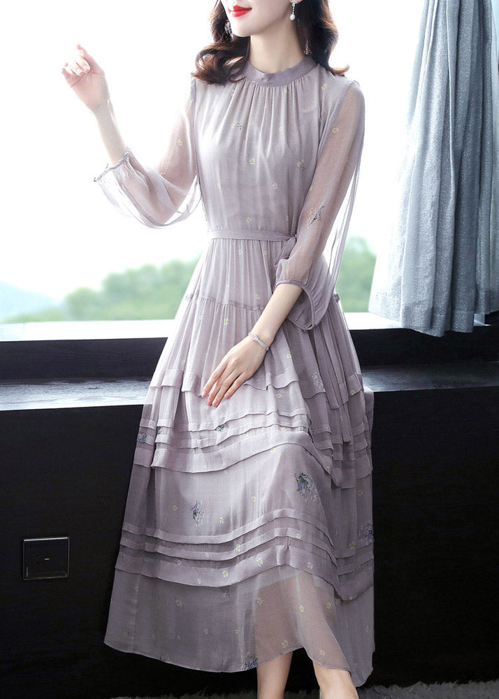 Stylish Grey O-Neck Embroideried Patchwork Silk Maxi Dress Spring