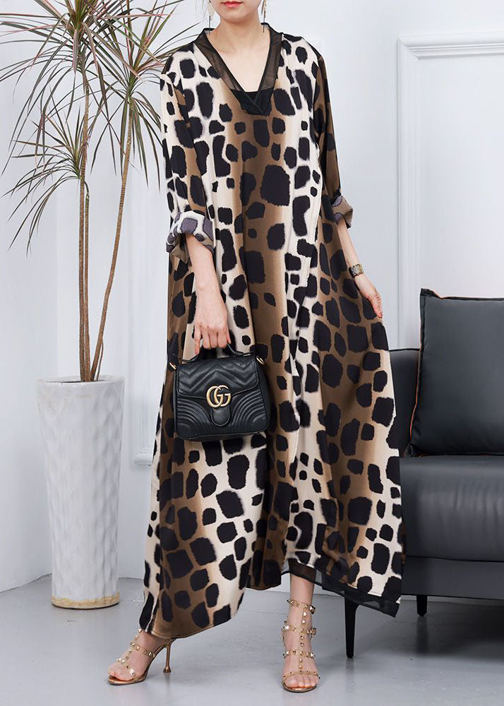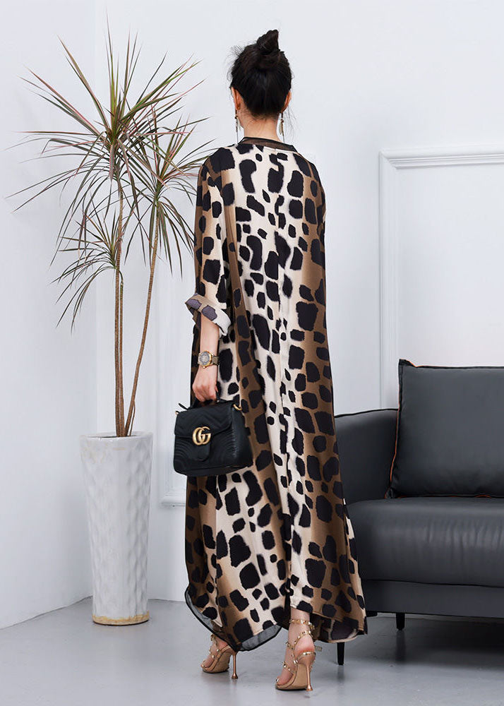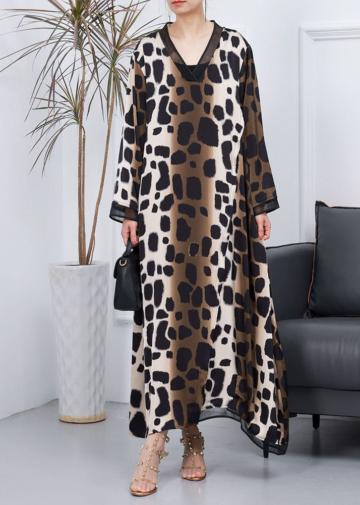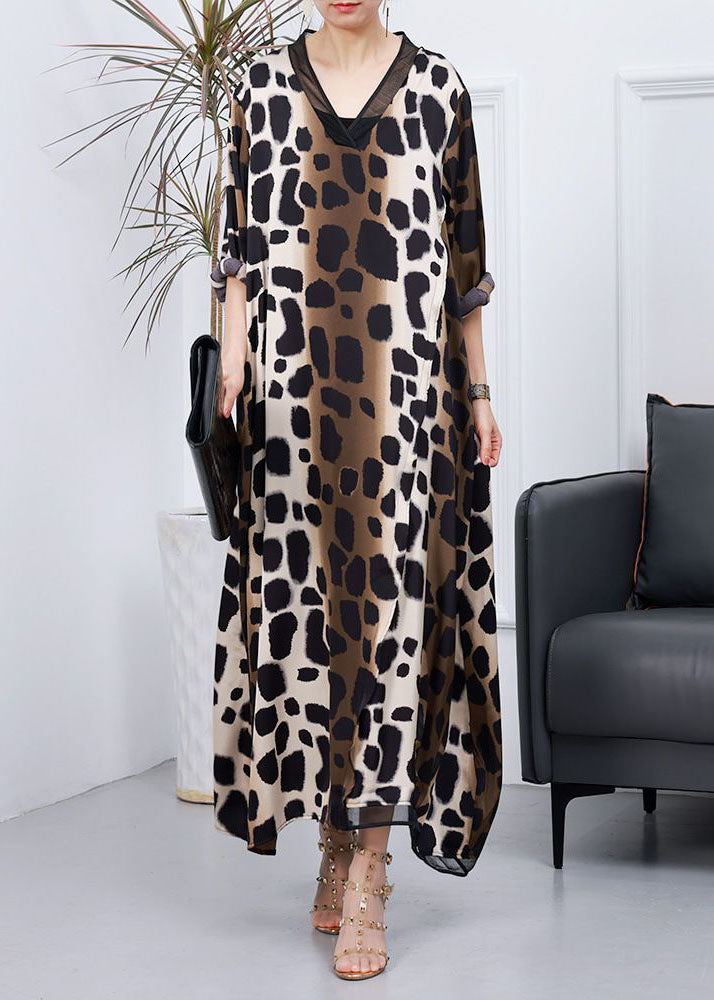 Stylish Leopard V Neck Patchwork Silk Asymmetrical Dress Spring