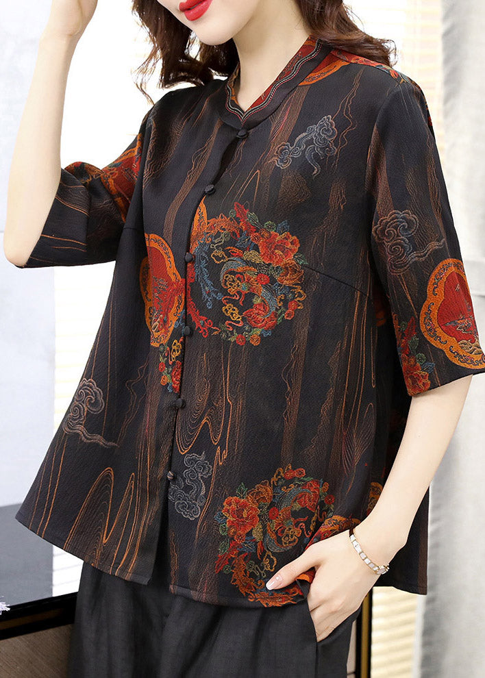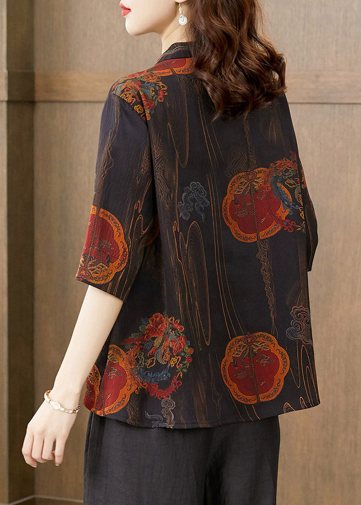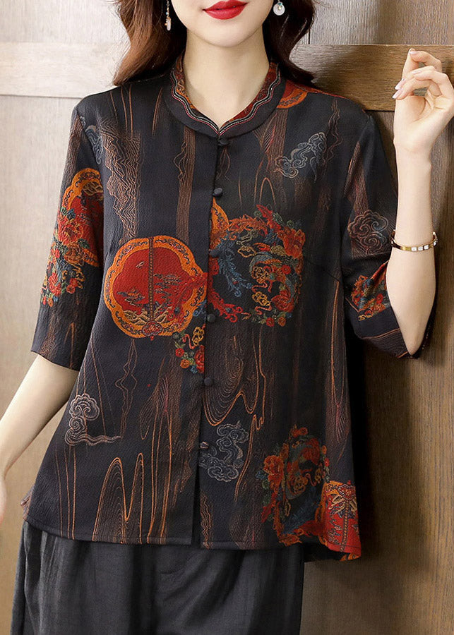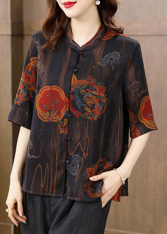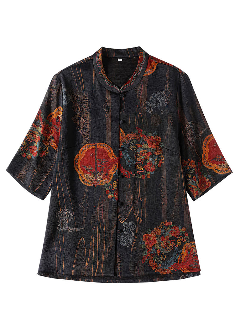 Unique Black Floral Peter Pan Collar Print Button Silk Shirt Half Sleeve