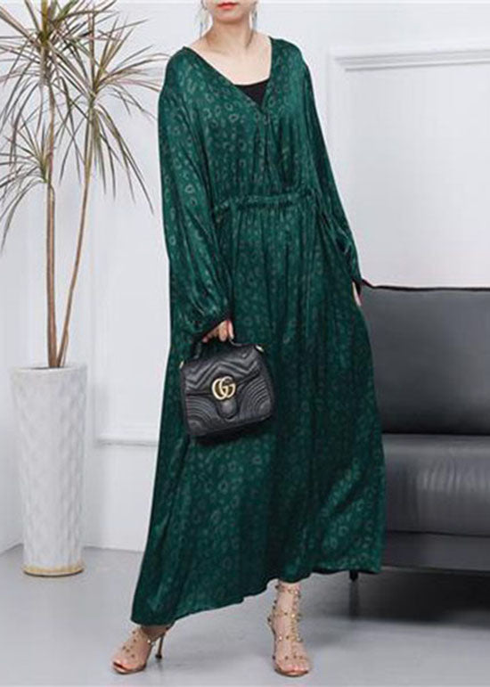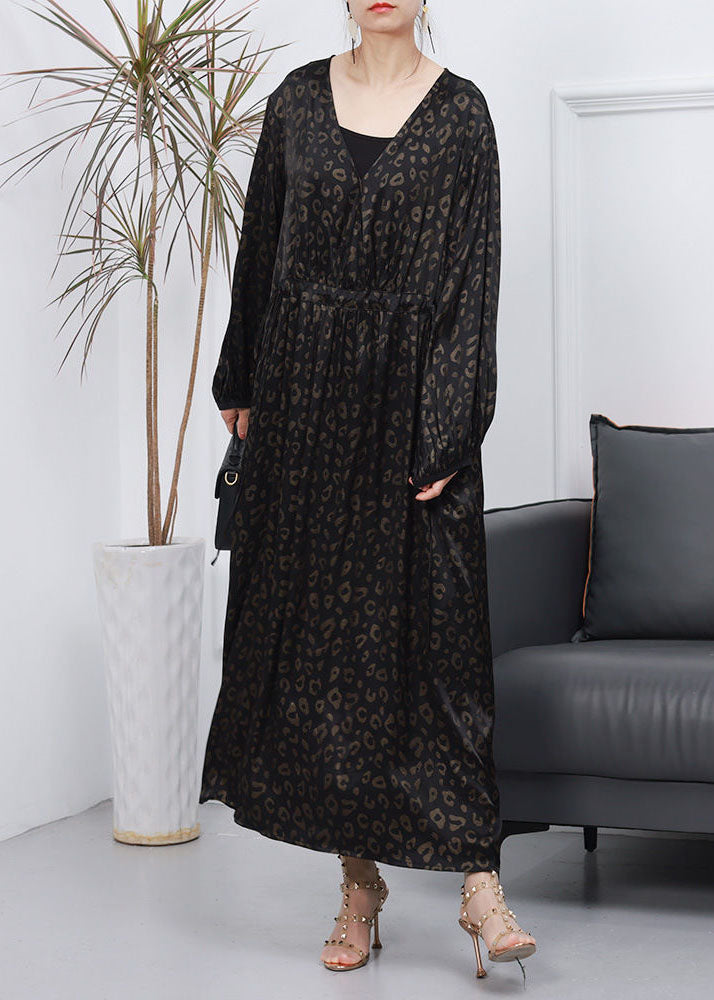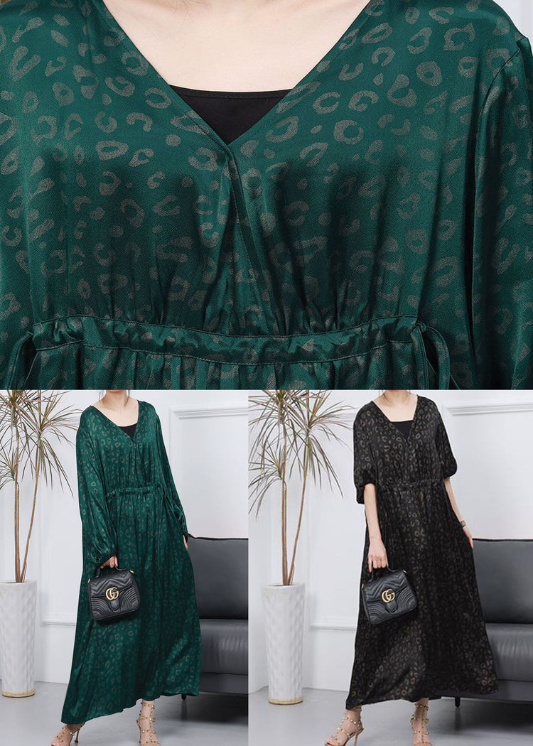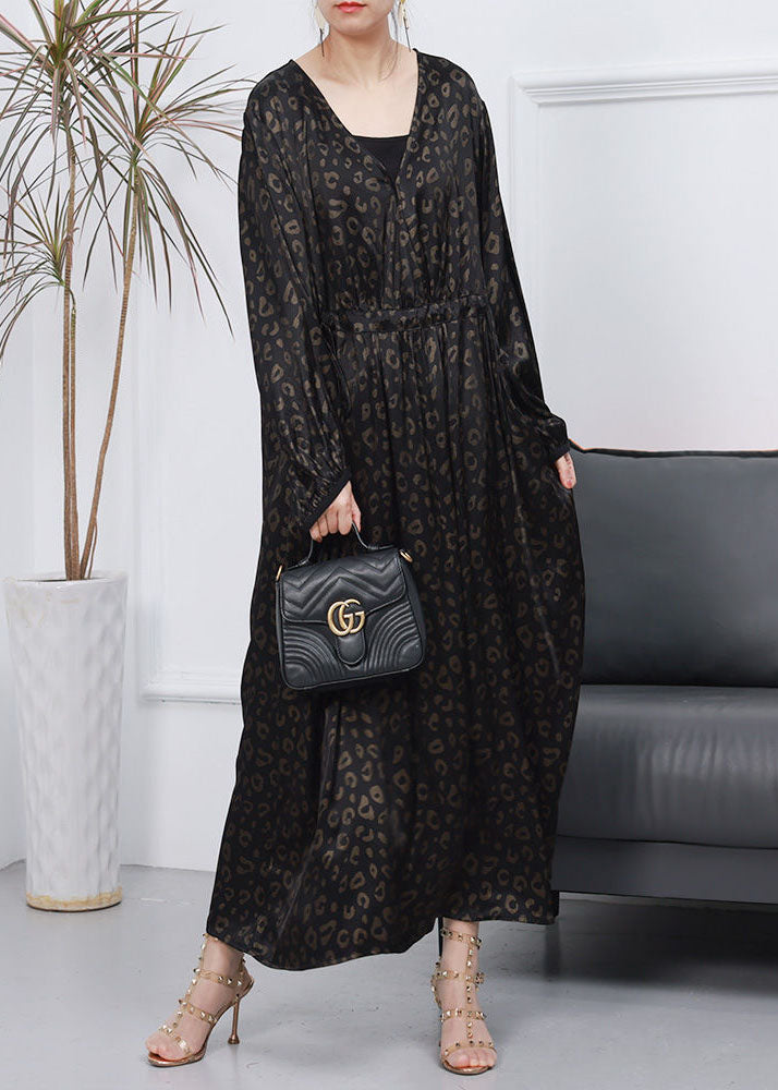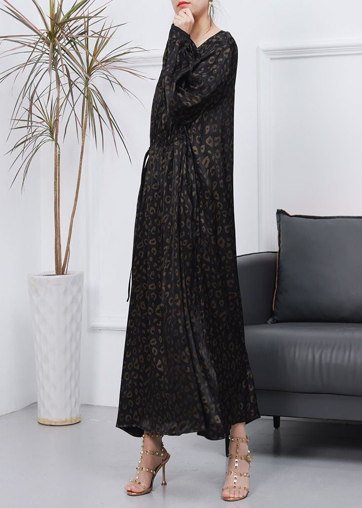 Unique Black V Neck Print Patchwork Drawstring Silk Dress Spring