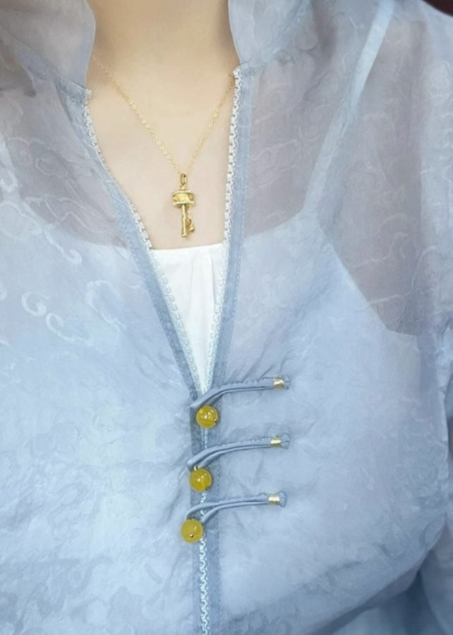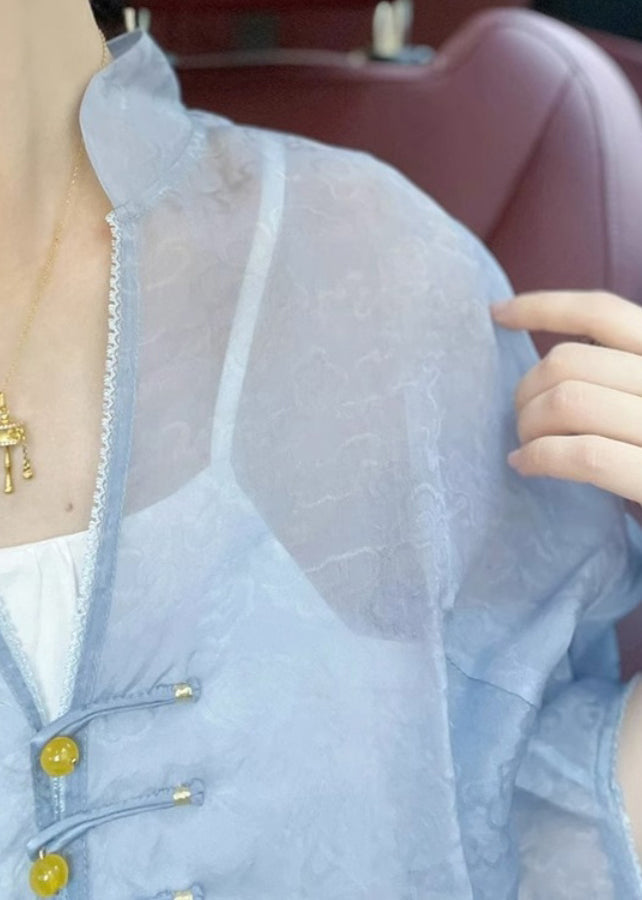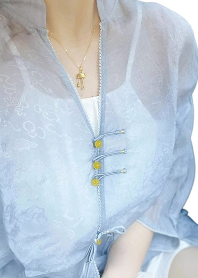 Unique Blue V Neck Button Print Patchwork Silk Shirt Tops Fall