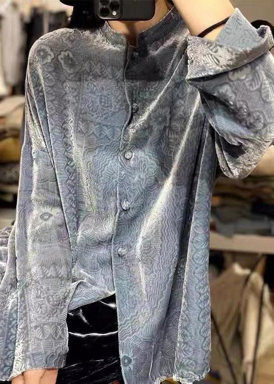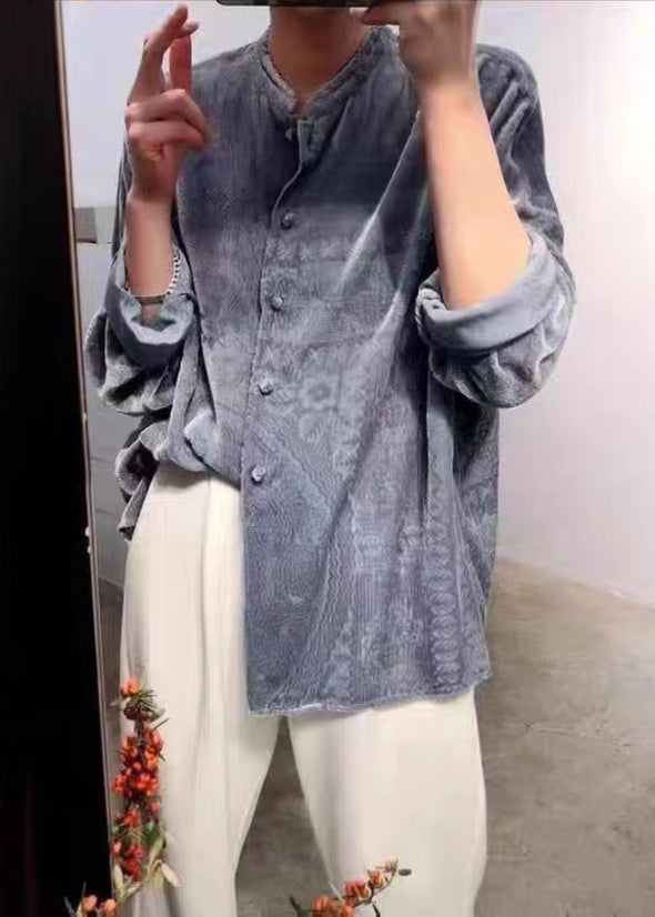 Unique Grey Button Patchwork Silk Velour Shirts Long Sleeve
