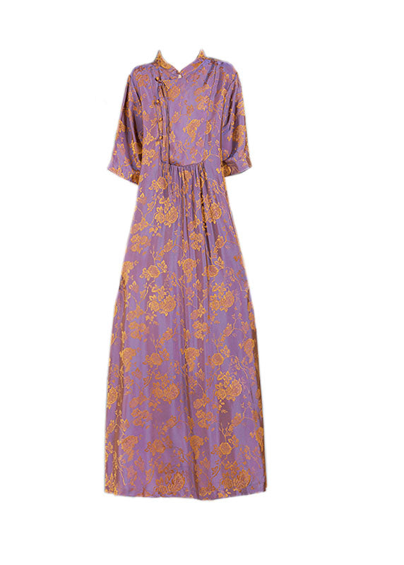 Unique Light Purple Stand Collar Jacquard Side Open Oriental Button Silk Dress Half Sleeve