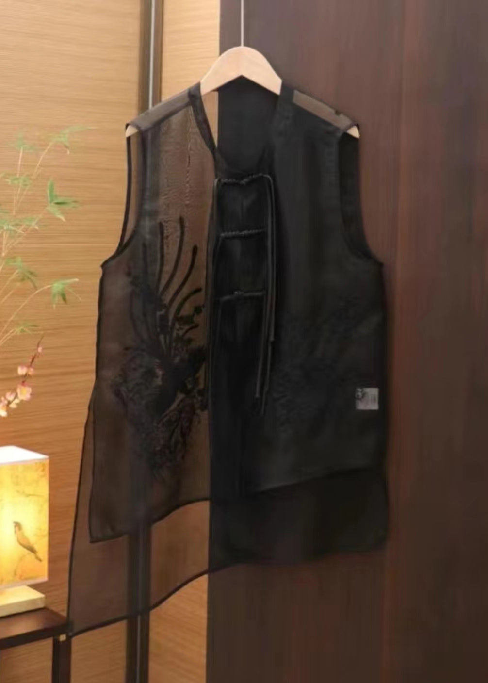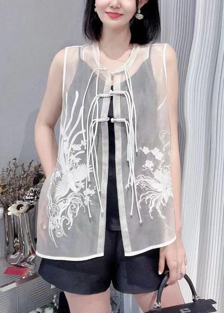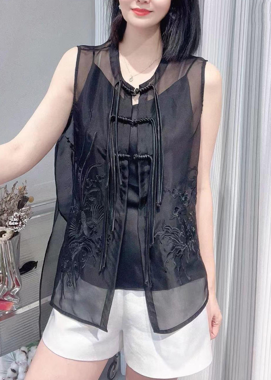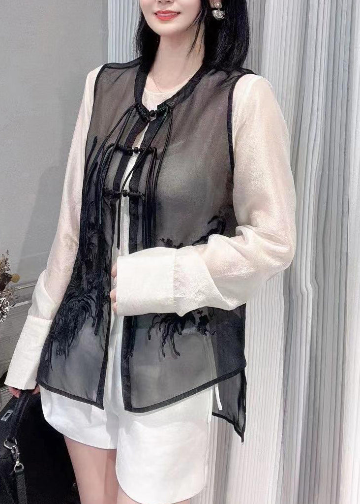 Vogue Black O-Neck Embroideried Button Silk Waistcoat Summer